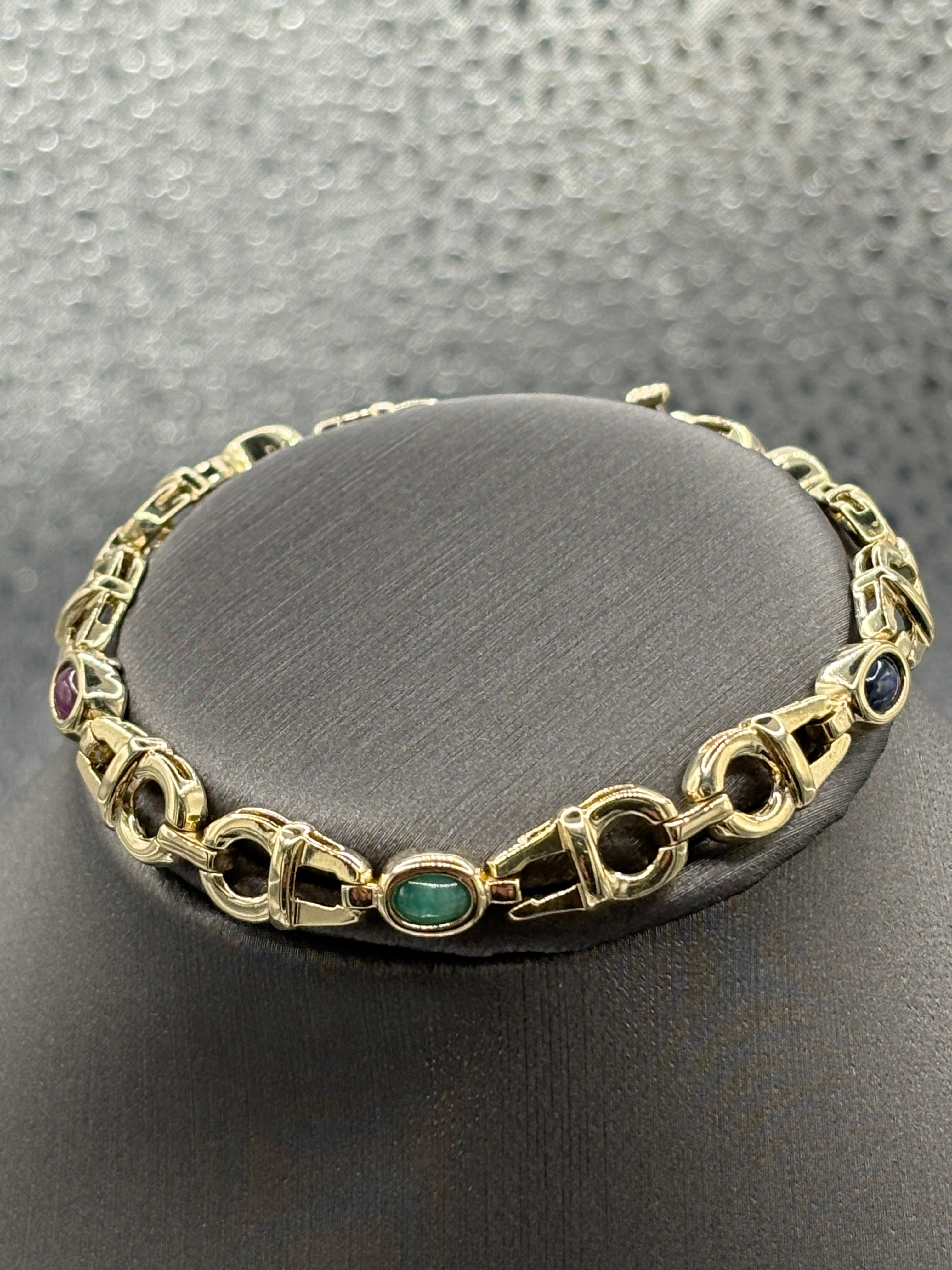 This gorgeous ladies colored stone bracelet was designed, made and imported from Italy. This beautiful bracelet is set with two cabochon shaped rubies, two Sapphires and one Emerald. Beautiful in every way, some lucky lady will love this bracelet.