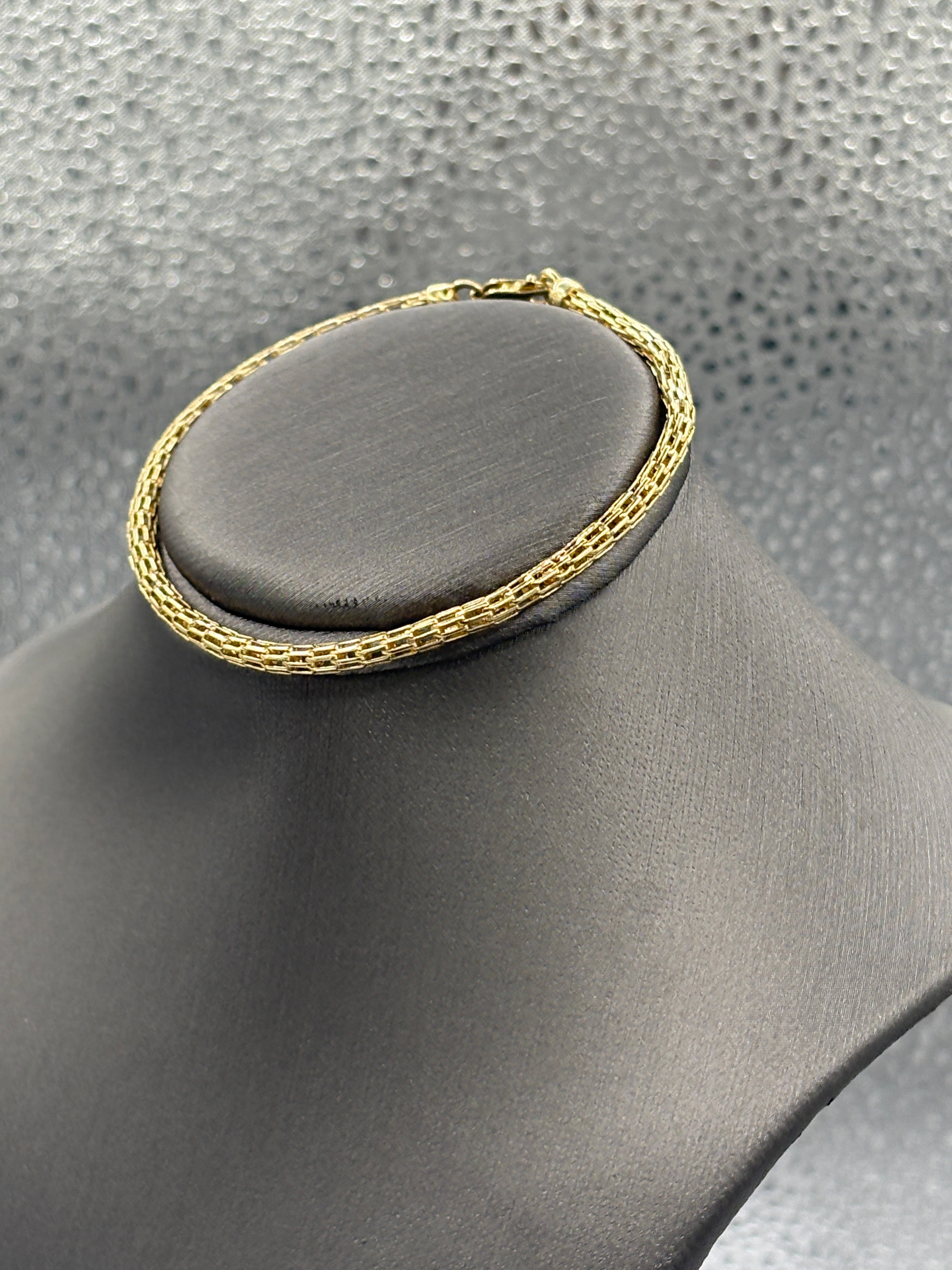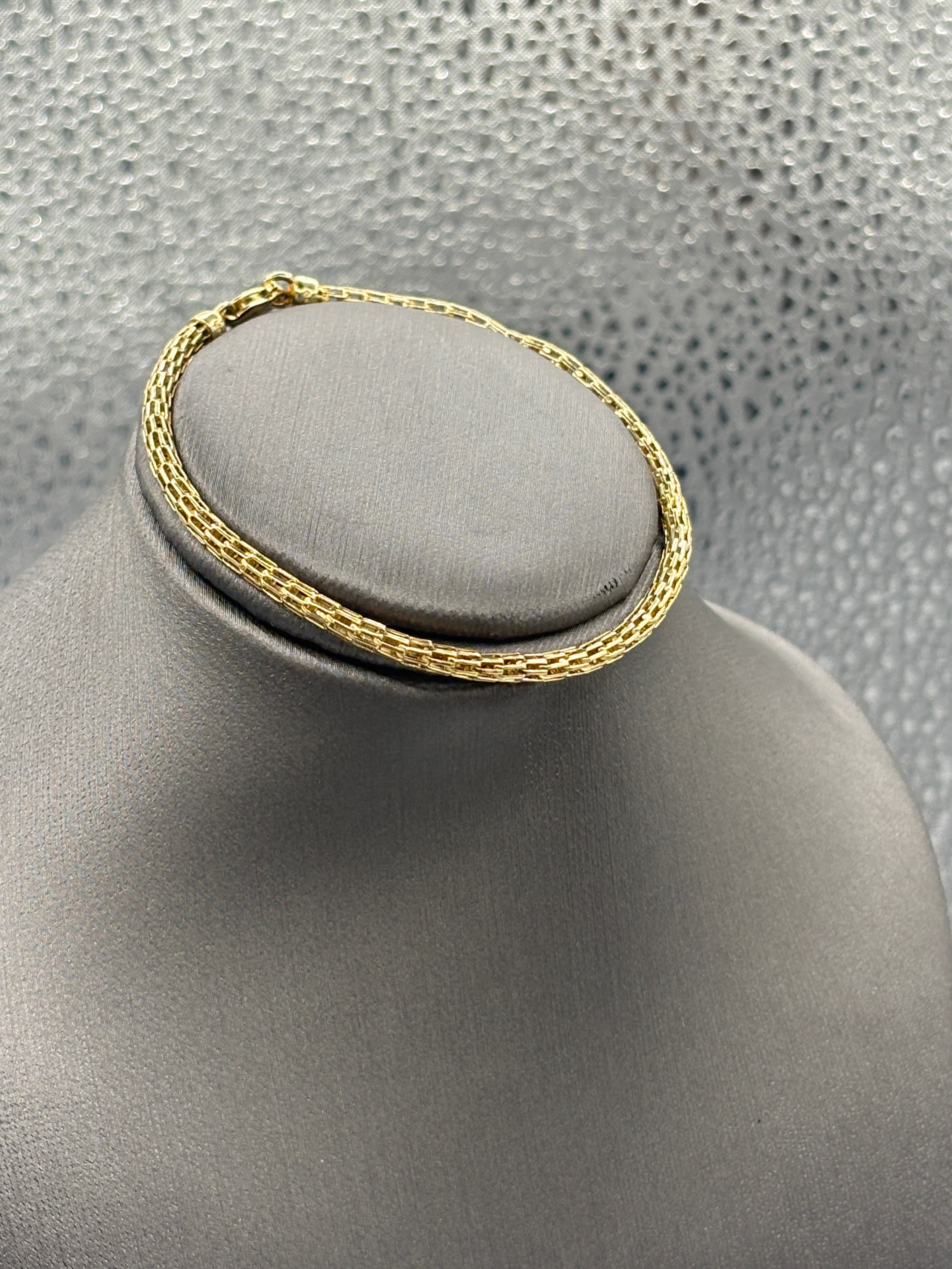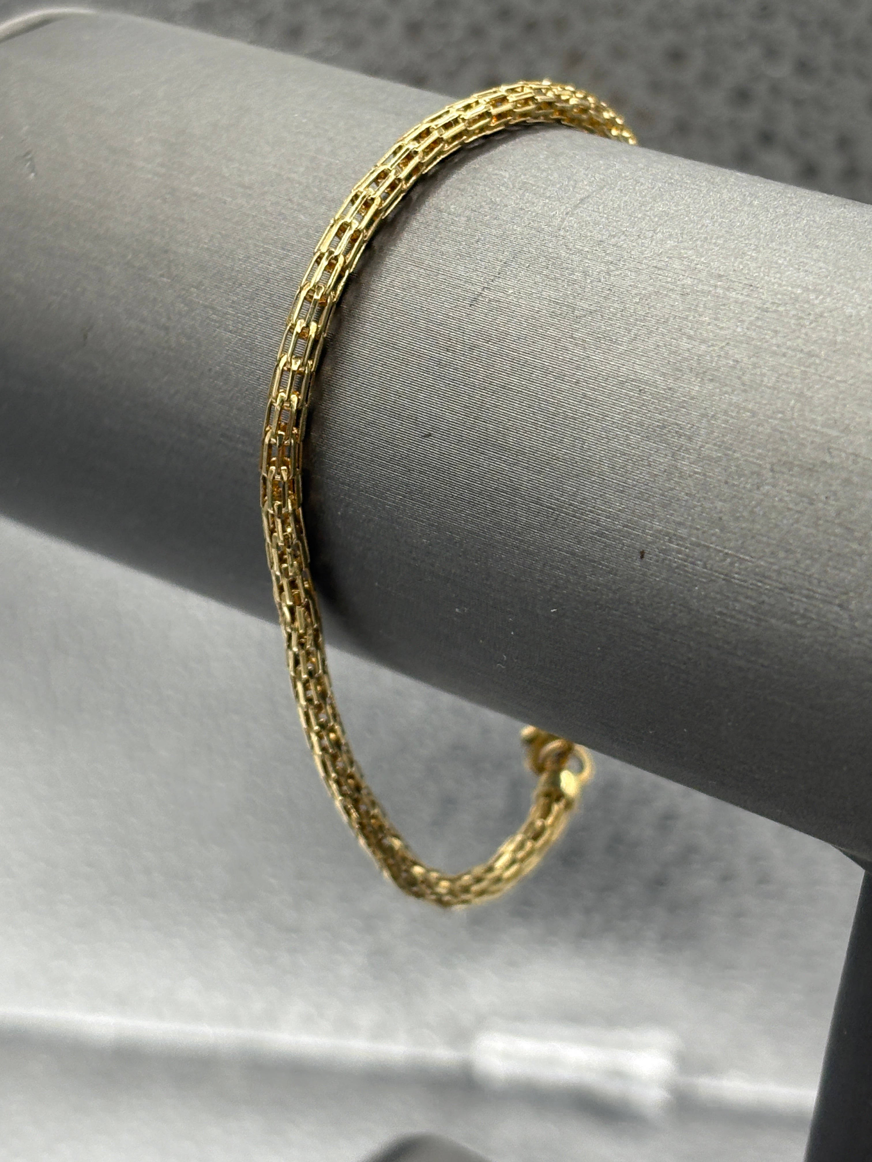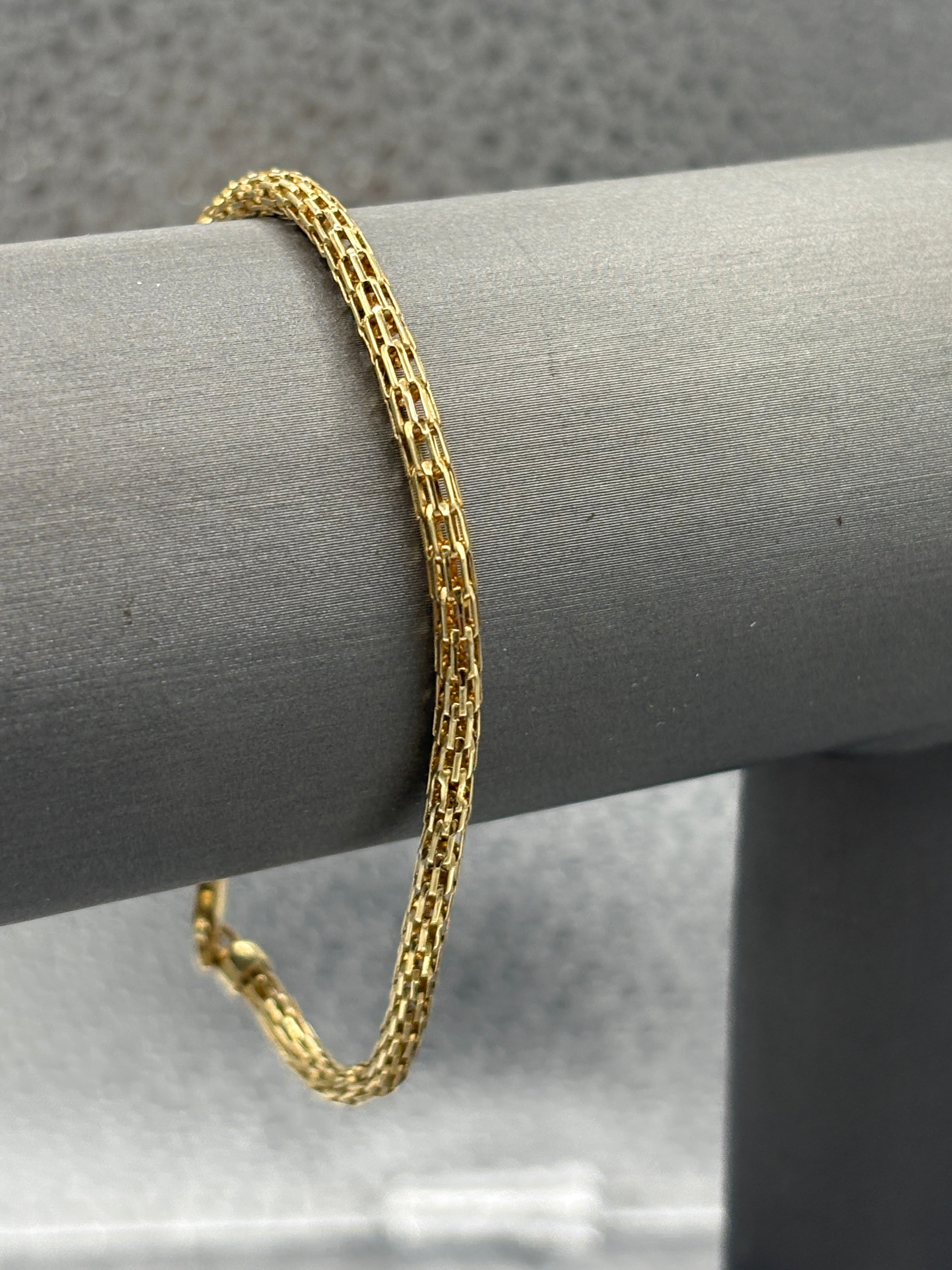 This beautiful bracelet is crafted in 14 karat solid yellow gold and features a two row Bismarck link design. Soft to the touch, very feminine and slightly stretchable, this bracelet is great for every day.