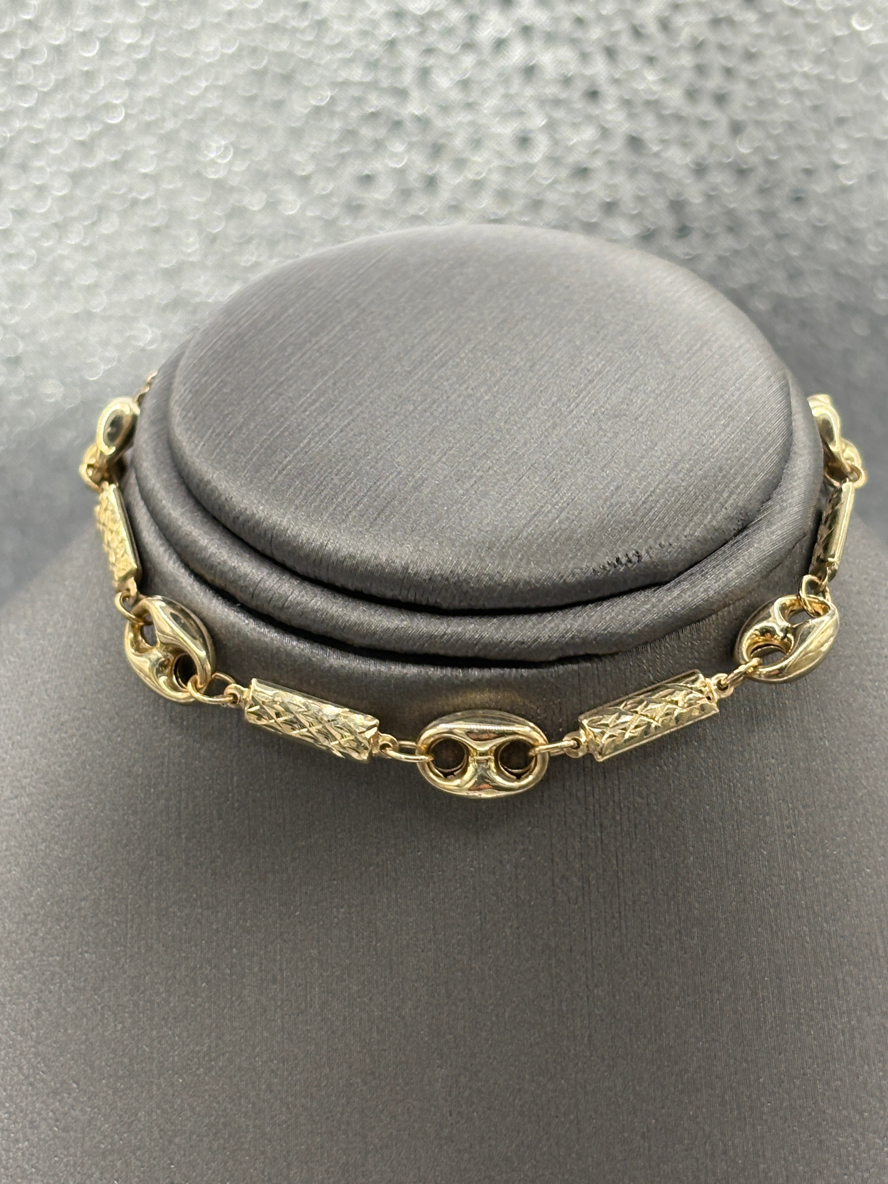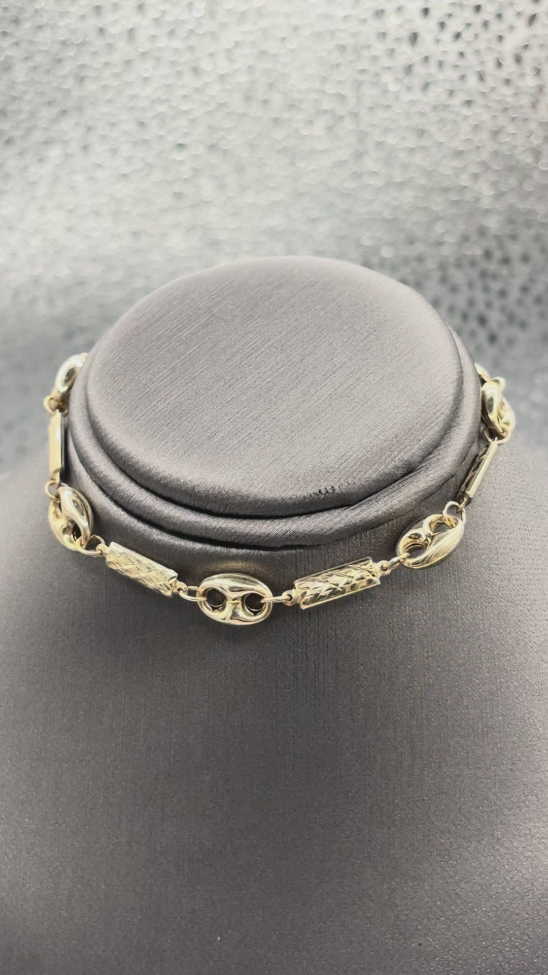This unique bracelet was designed, made and imported from Italy. Made in 14 karat solid yellow gold, this bracelet is a lovely combination of two different gold links. Secured with a safety lock for security. Comfortable to wear and looks great on any woman’s wrist!