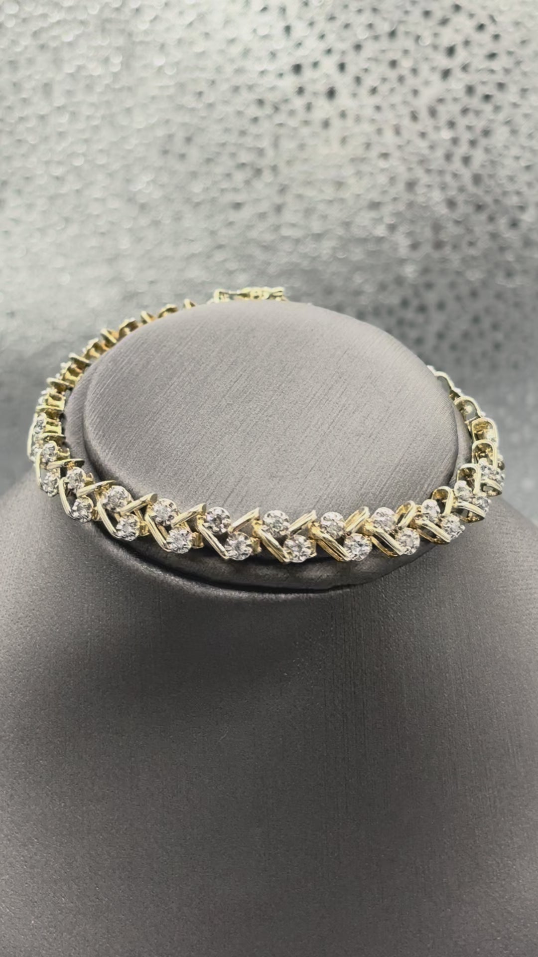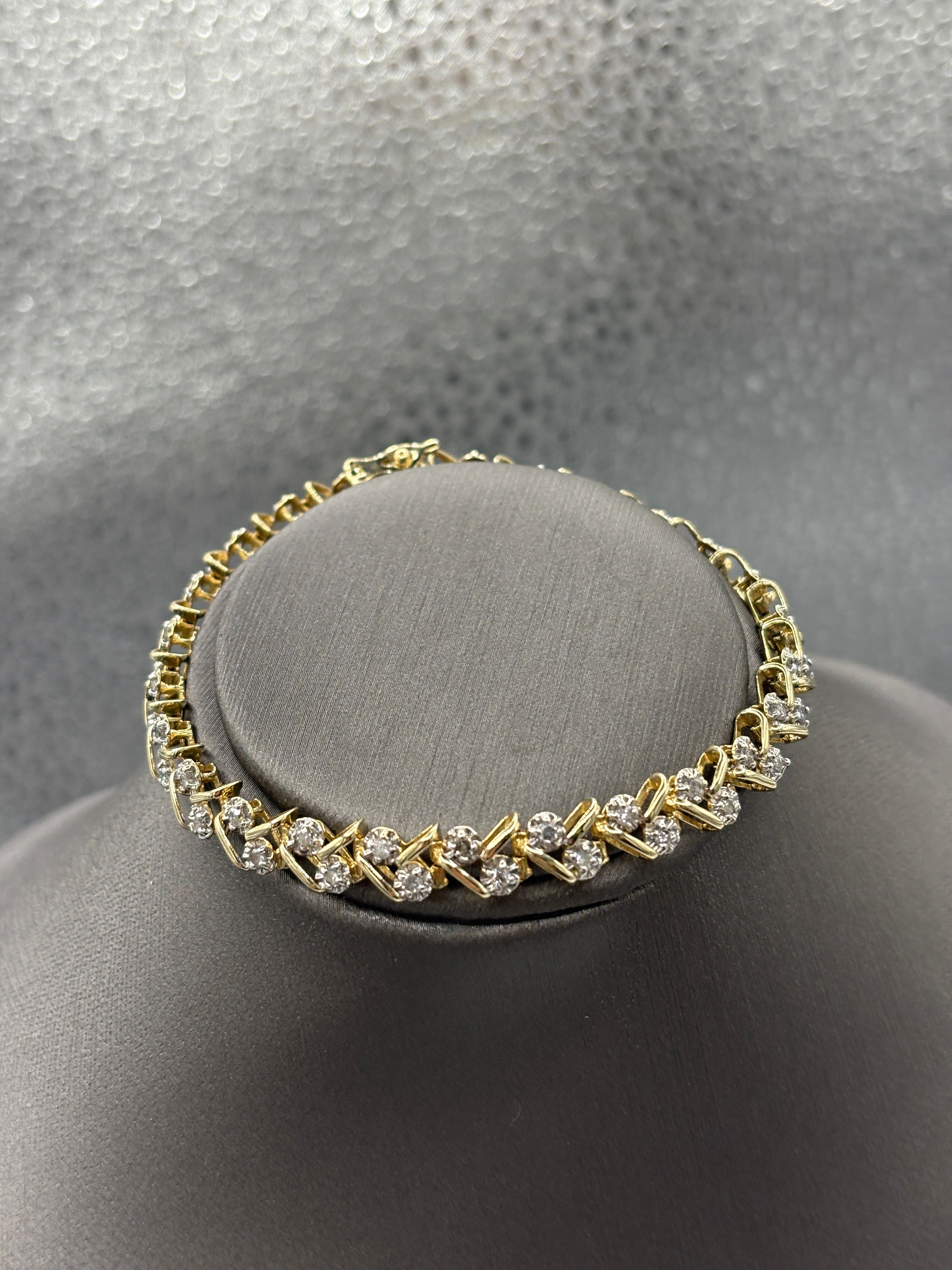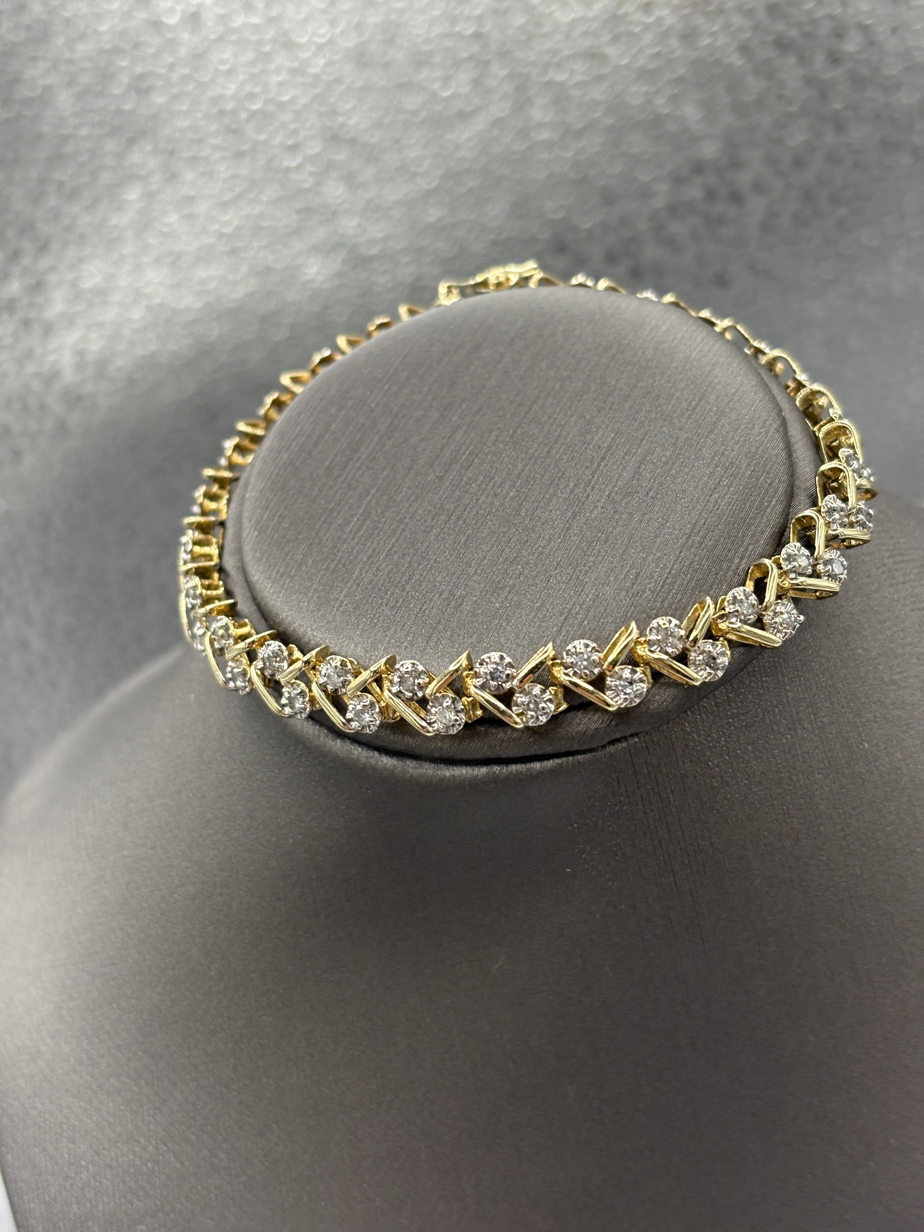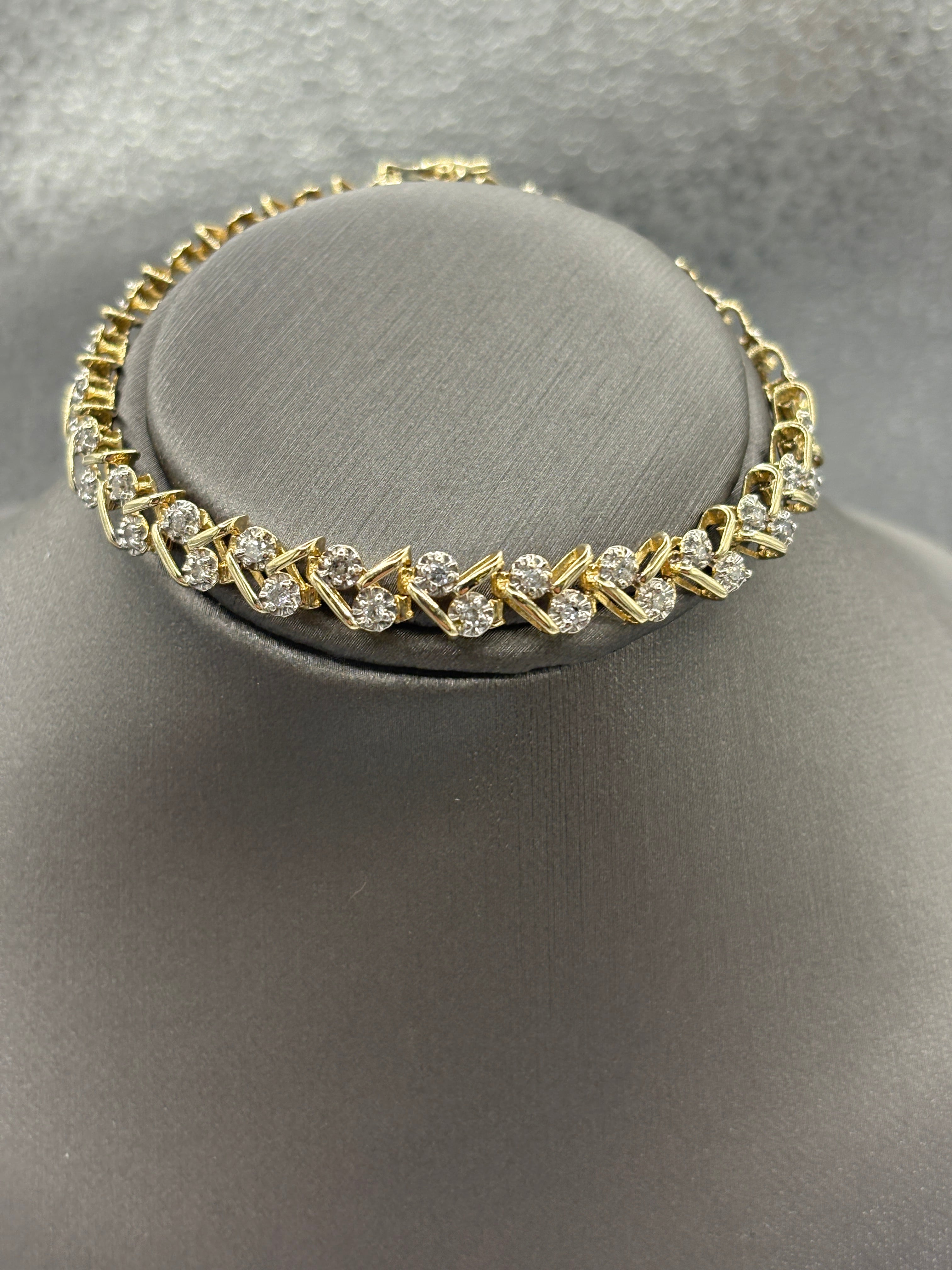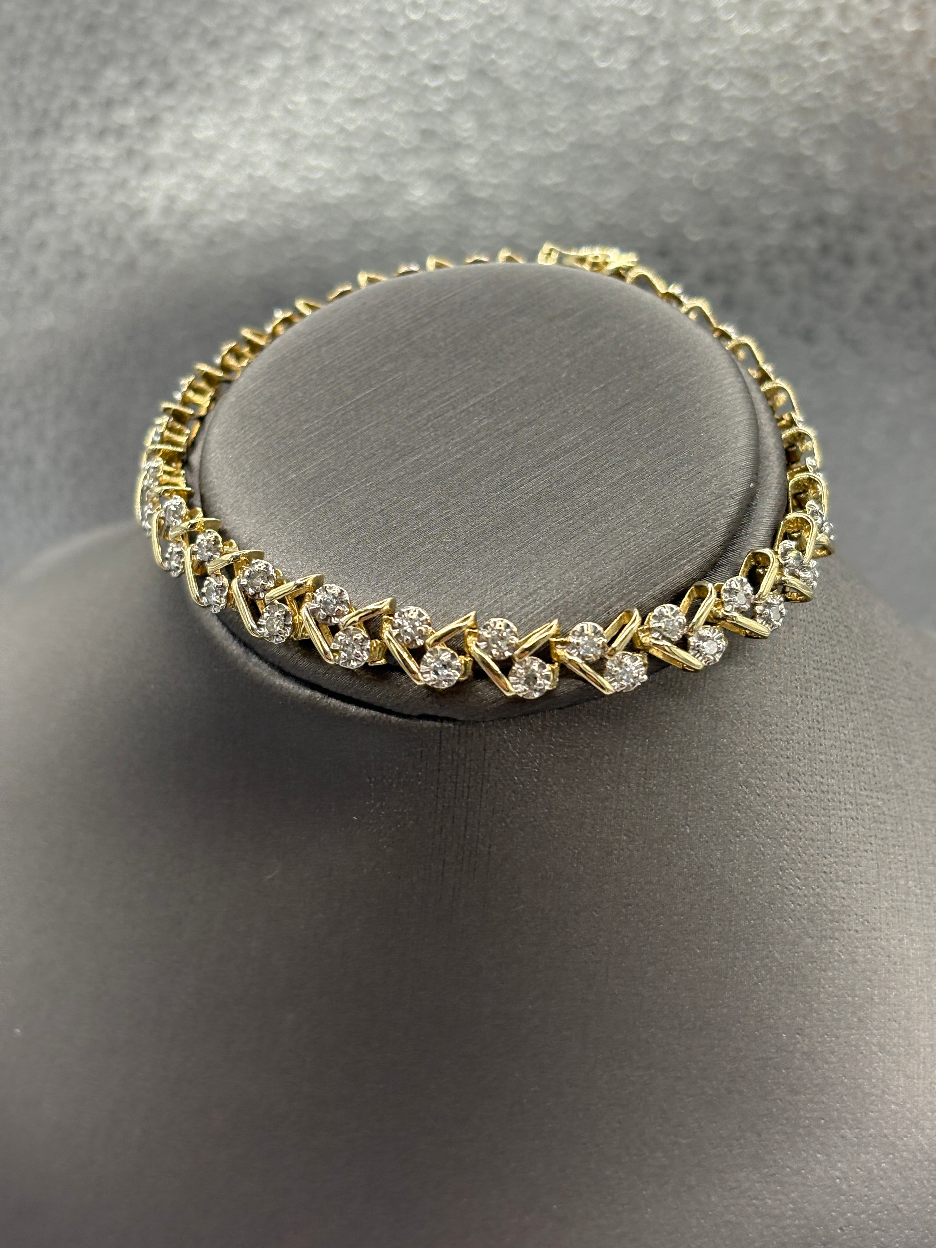 A beautiful variation of the diamond tennis bracelet. Designed and made in 14 karat solid yellow gold. The scattered diamond clusters bring style and diamond brilliance to this gorgeous bracelet. Secured with a double action lock with a figure 8 closure for safety.