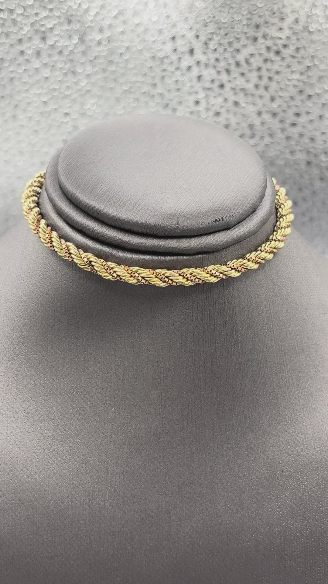 Originally designed, made and imported from Italy. This unique rope bracelet was crafted in 14 karat solid yellow gold with 14 karat rose gold box chain wrapped on each curve of the rope. Secured with a heavy 14 karat barrel lock for added security. Only one available!