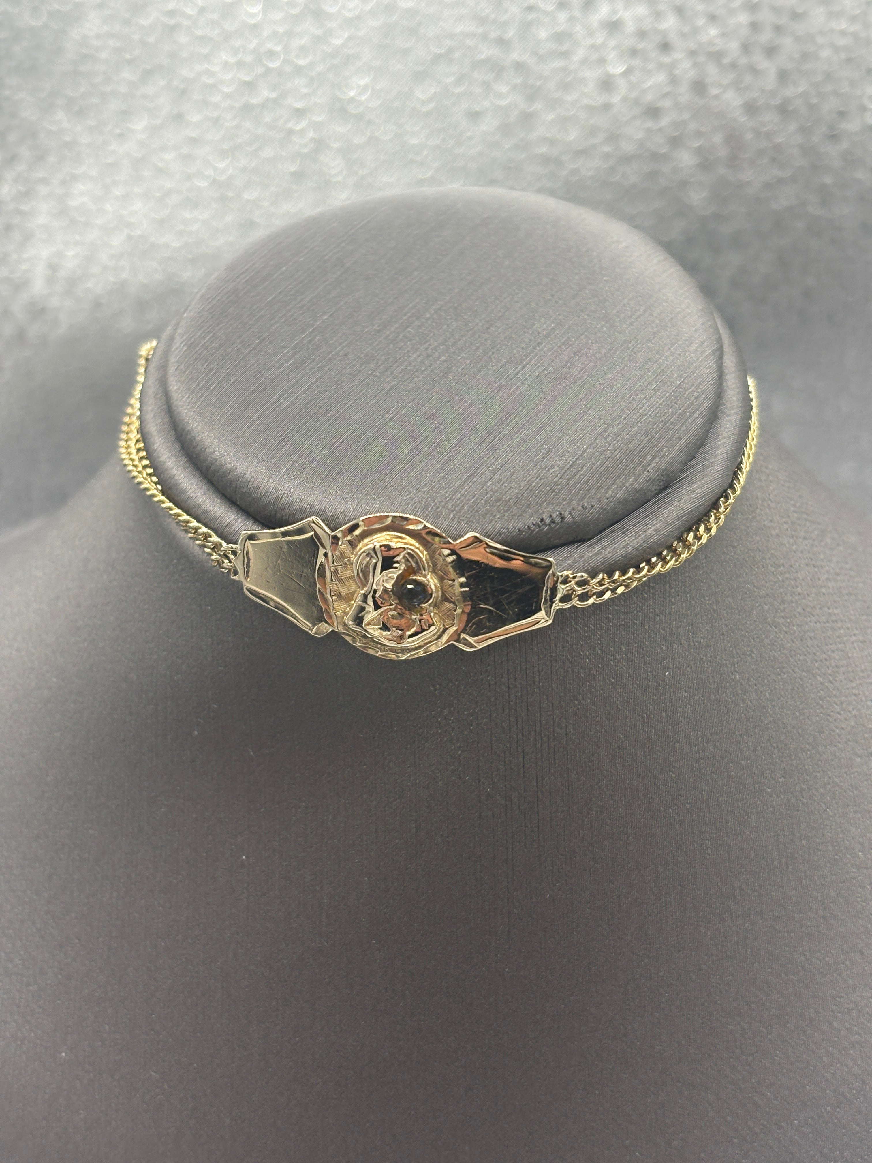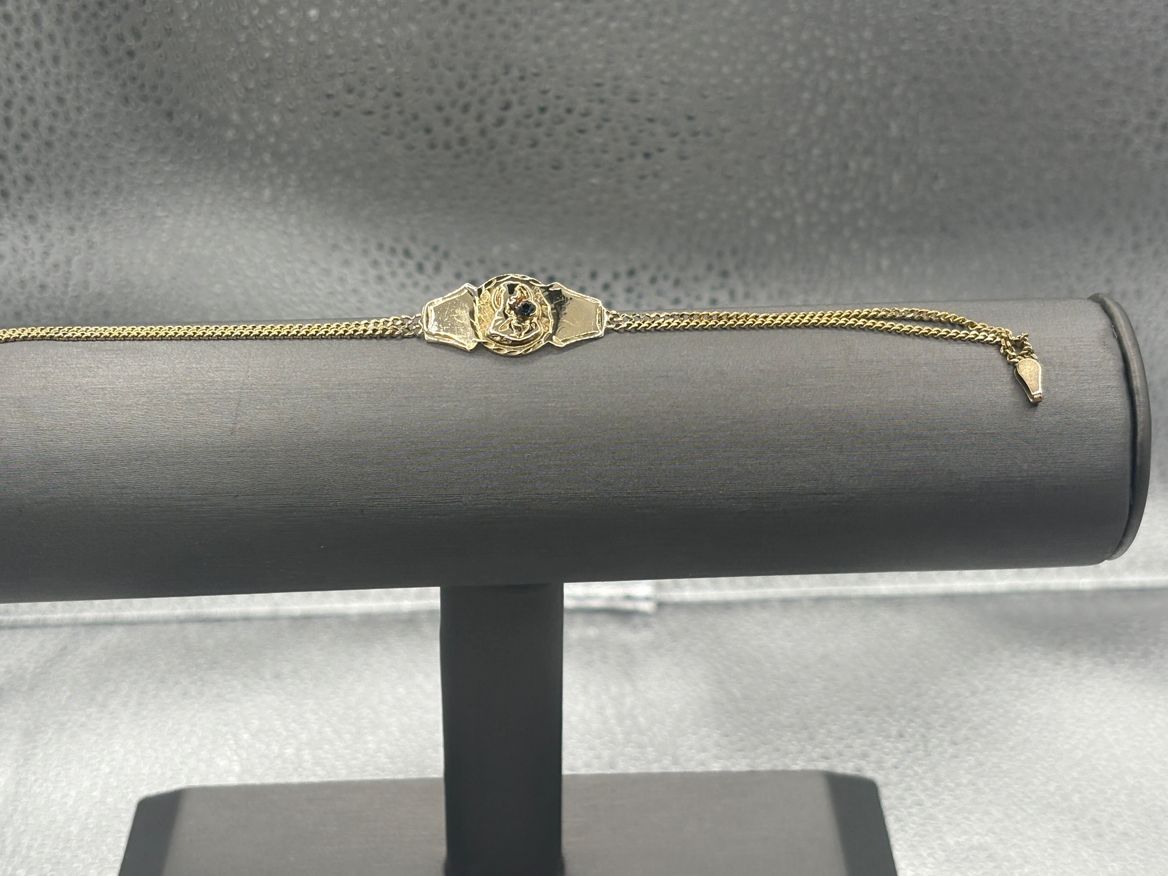 This beautiful gold bracelet with a religious medallion depicting the Virgin Mary is what makes it so special! This bracelet features a flat, double link chain with a decorative centerpiece that contains the religious image with a small gemstone accent. The bracelet was designed and made in 14 karat, solid yellow gold. Perfect for any woman, any age!