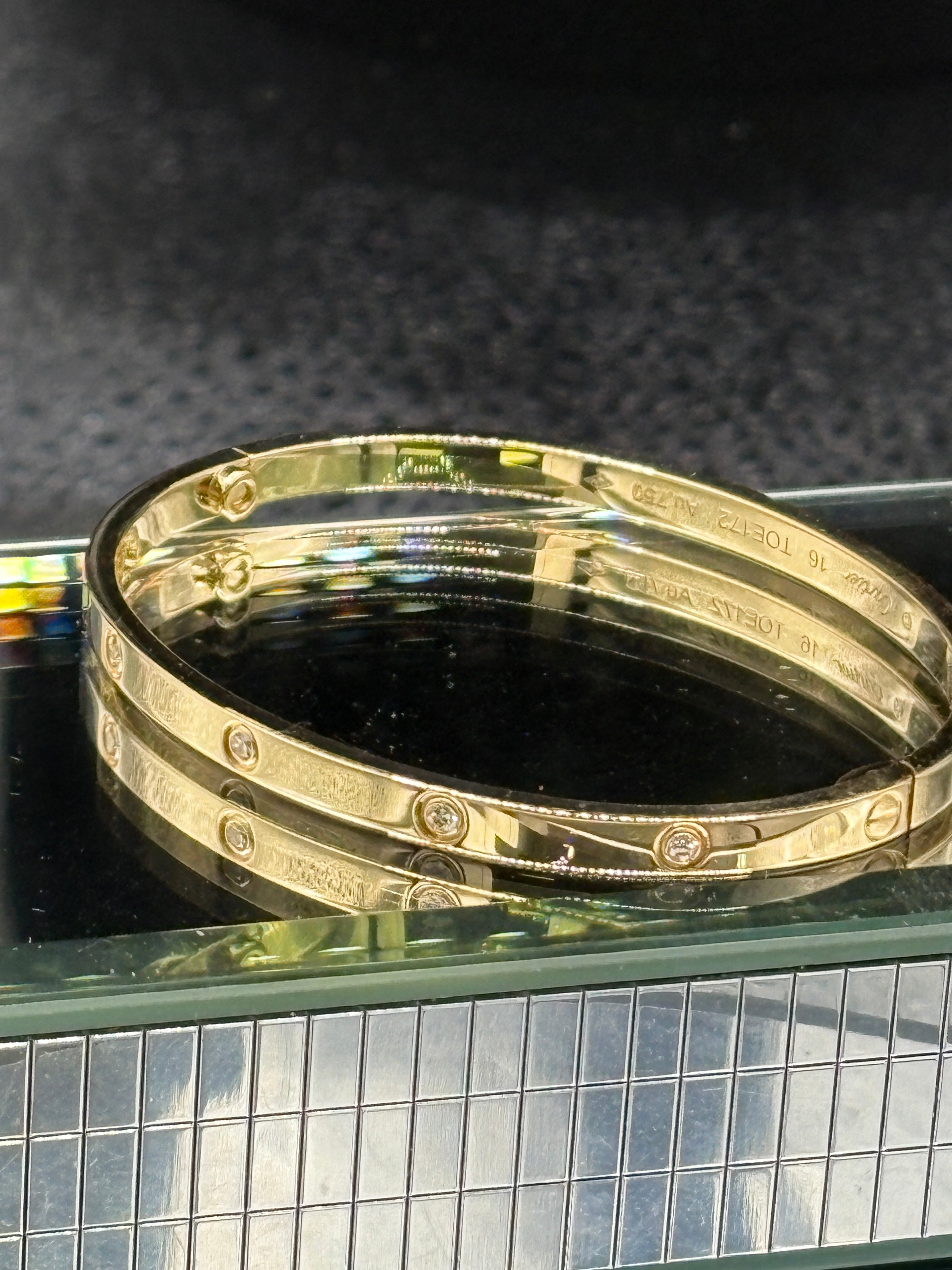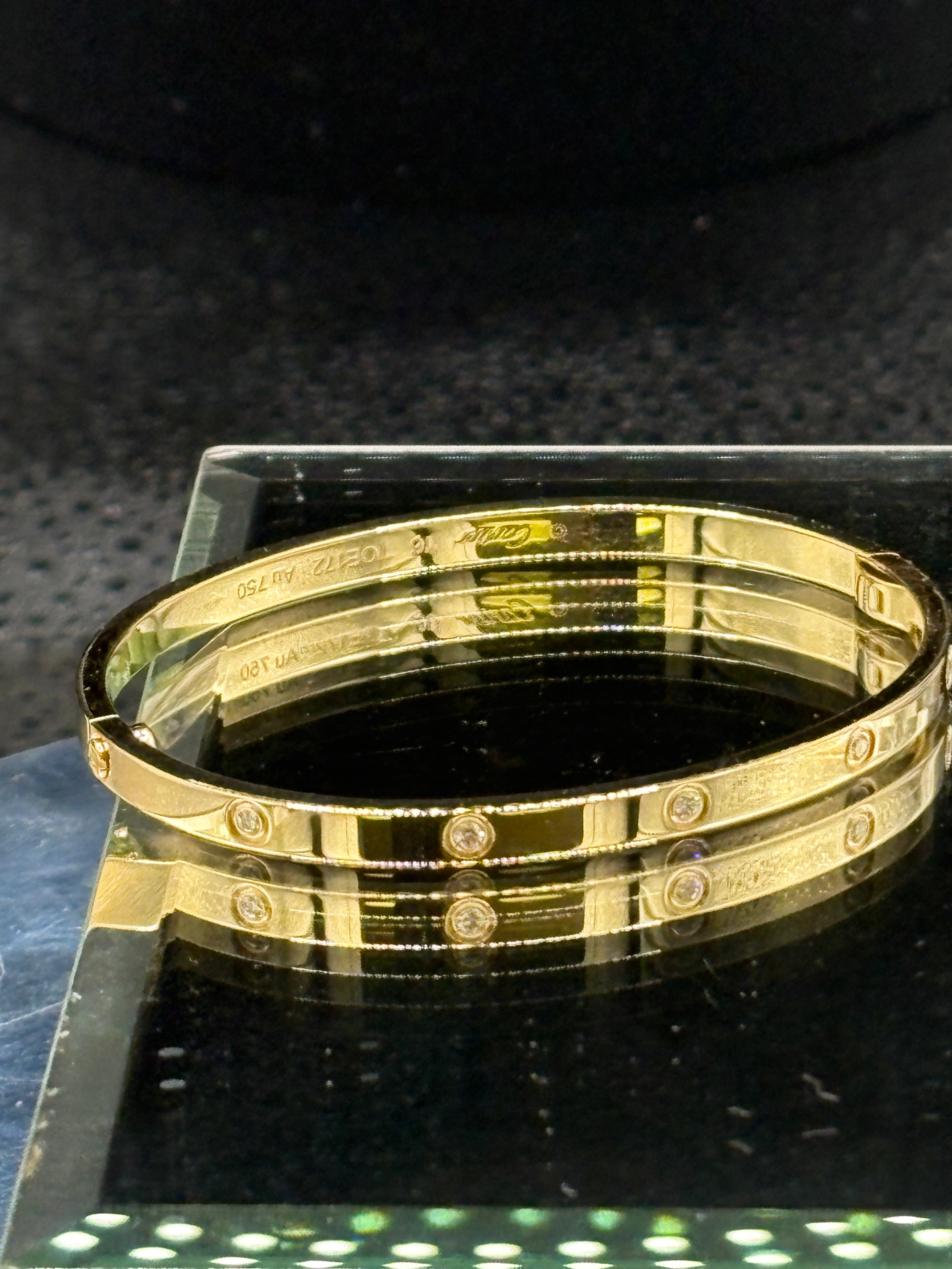 This magnificent 18 karat solid yellow gold full diamond love bracelet is another fabulous diamond bracelet from Cartier! Meticulously set with ten gorgeous fine white brilliant diamonds!