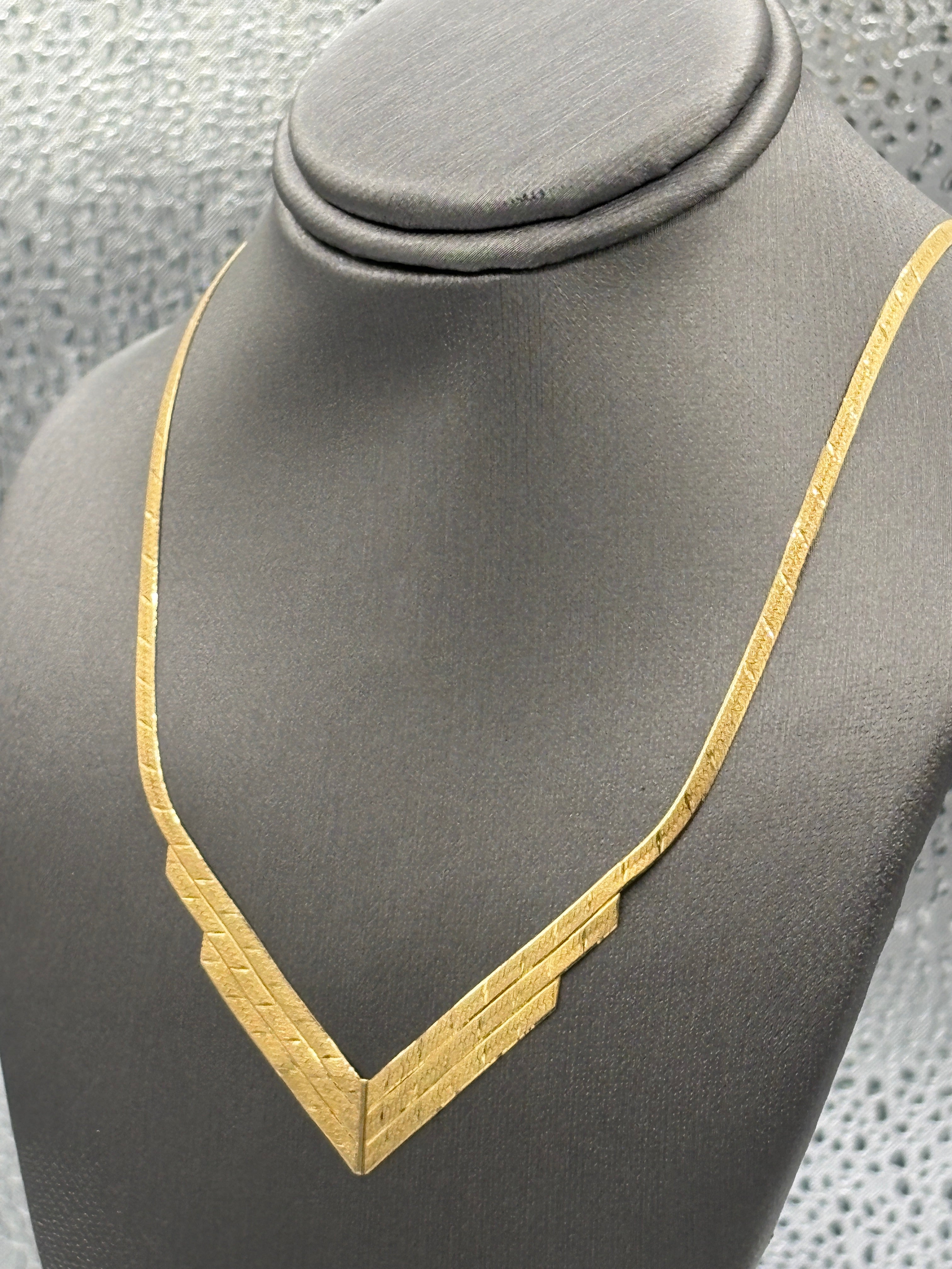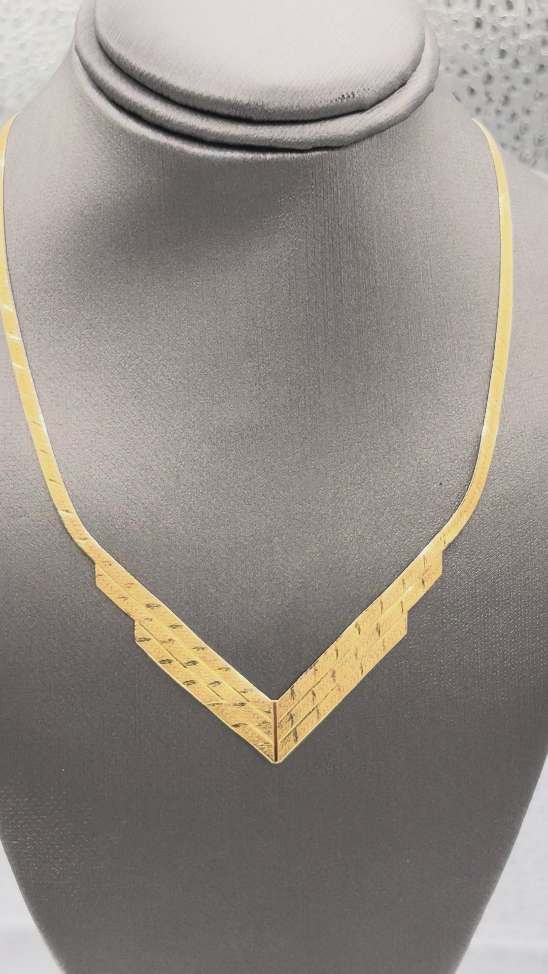This herringbone V shaped necklace was designed, made and imported from Italy. This fabulous necklace was made in 14 karat solid yellow gold. It offers two sides to wear on. Diamond cut on one side and high polished on the other. Gorgeous on a woman’s neck!
