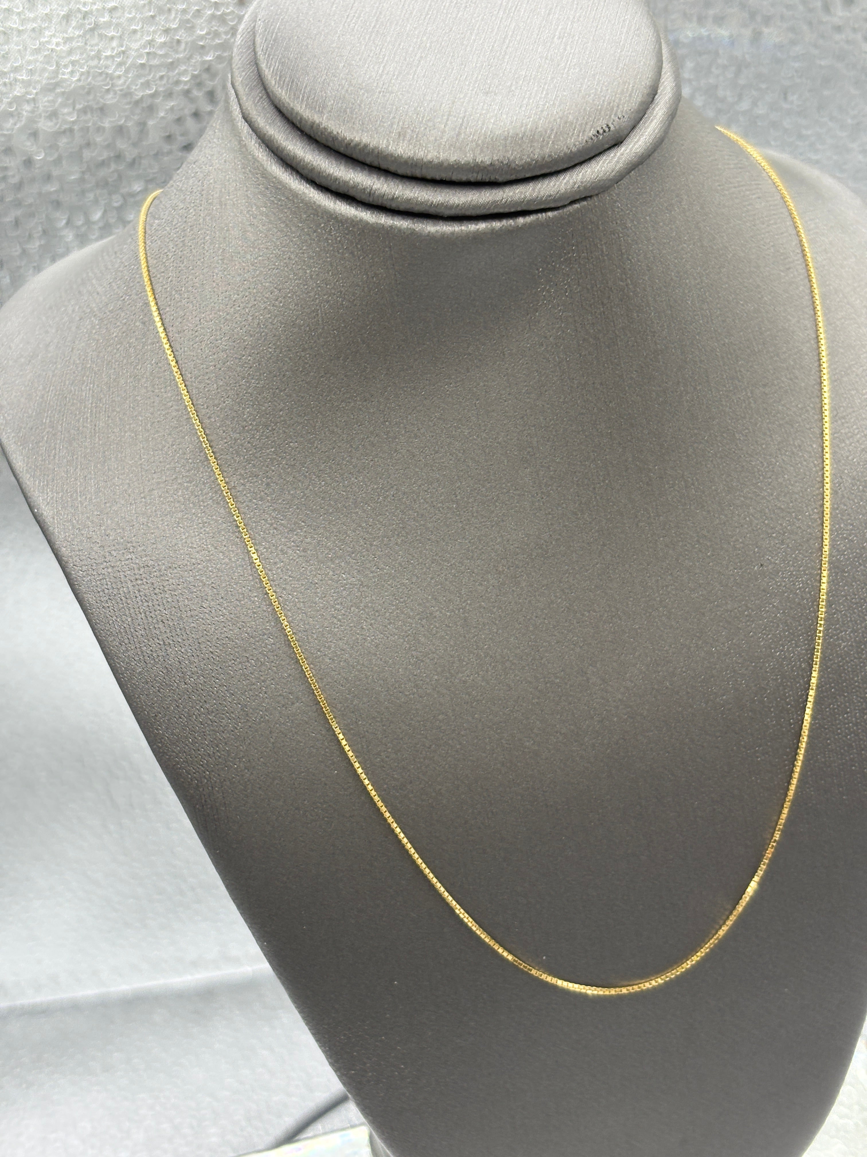 A classic box chain designed and made in 18 karat solid yellow gold! A beautiful chain by itself, also perfect to hang your favorite pendant or charms from. This chain has a beautiful luster to it and always looks sparkly and feminine.