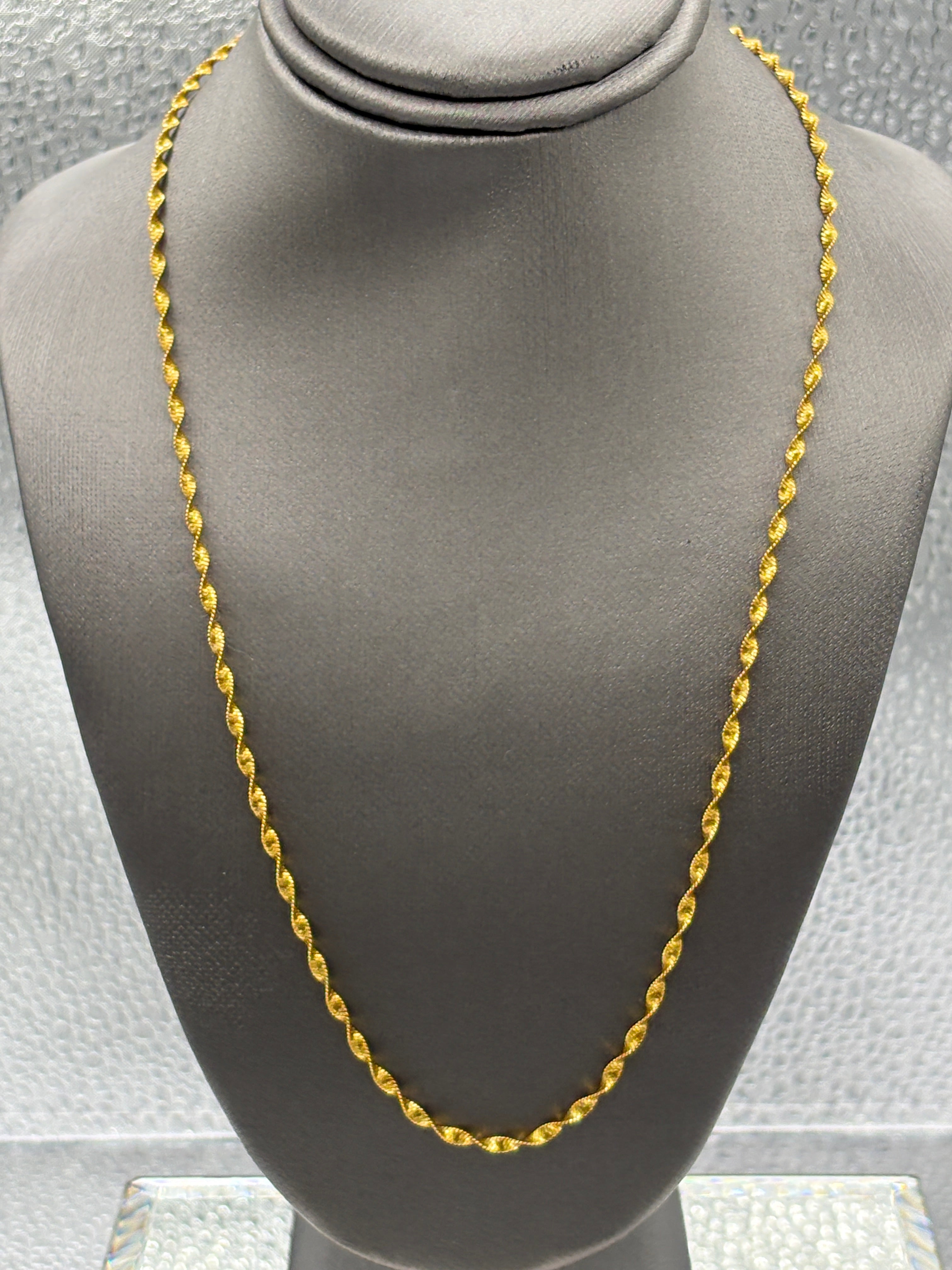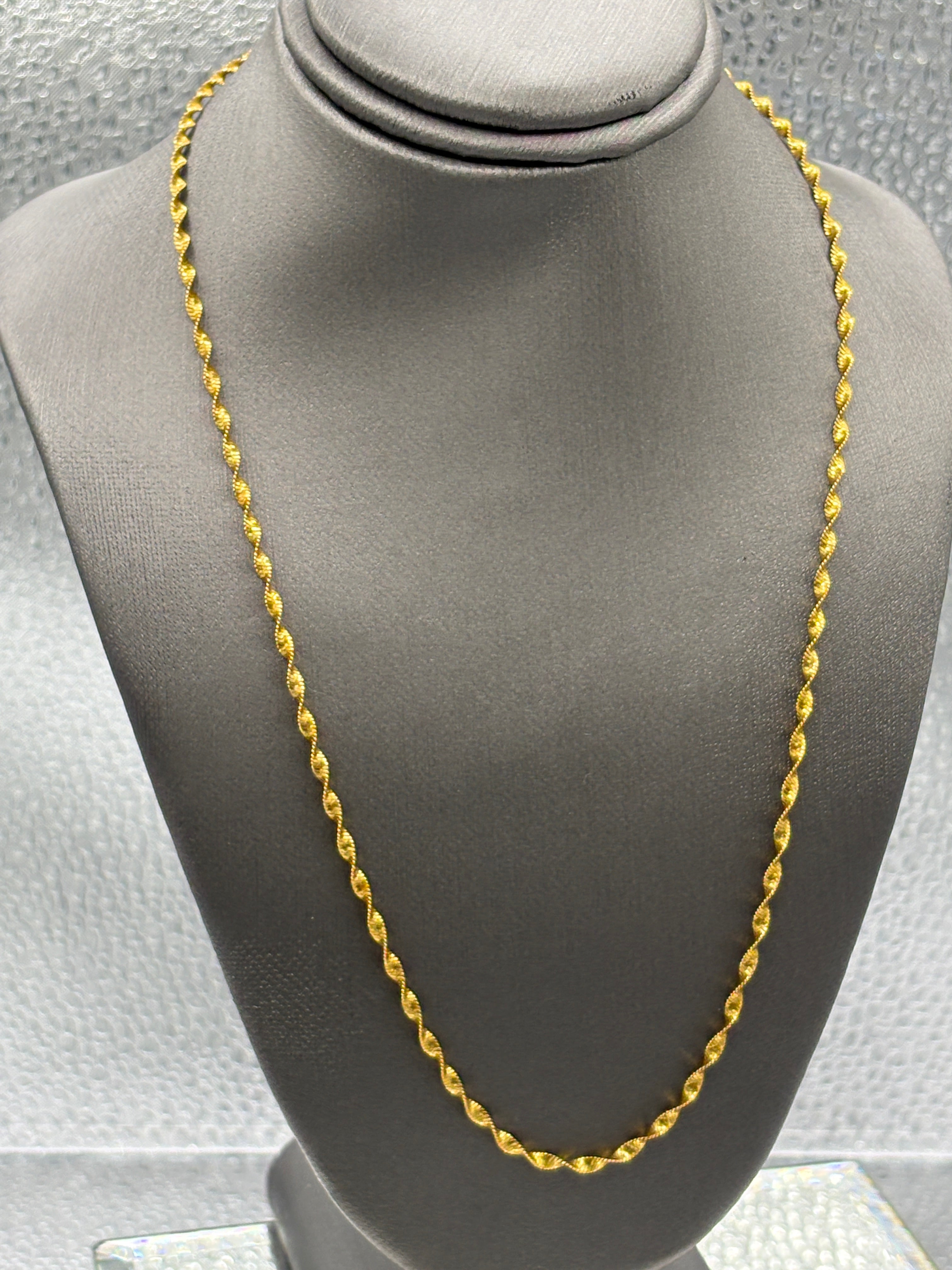 The twisted sparkle was designed, made and imported from Italy. Crafted in 18 karat solid yellow gold. A beautiful chain by itself, but also enhances any pendant you hang from it. Beautiful color, beautiful sparkle, beautiful chain!