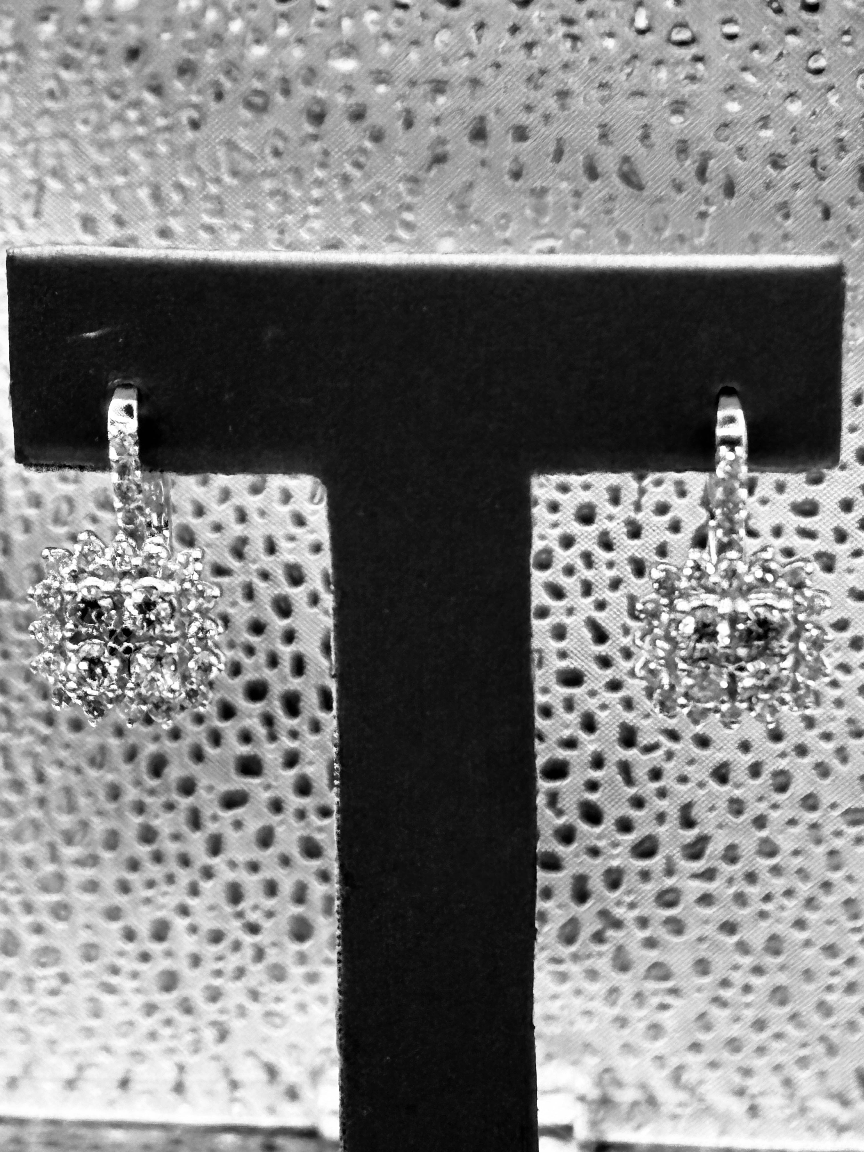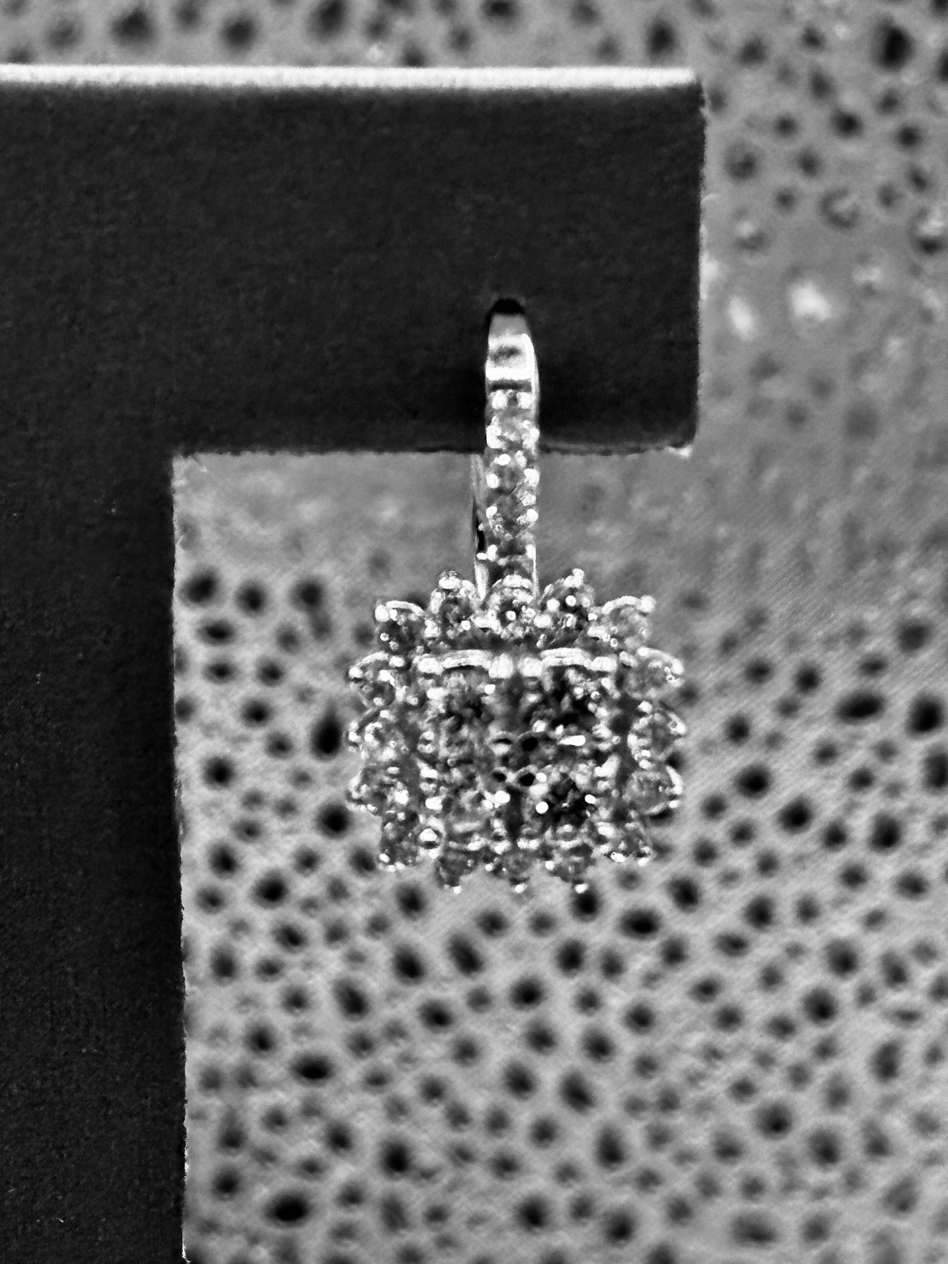 These diamond drop earrings feature a modern cluster design set in 18 karat solid white gold. Last night, the earrings showcase, multiple diamonds, arranged a floral pattern, creating a sophisticated sparkle effect.  Perfect for the woman who appreciates fine diamond jewelry for both their formal occasion where ability and investment value!