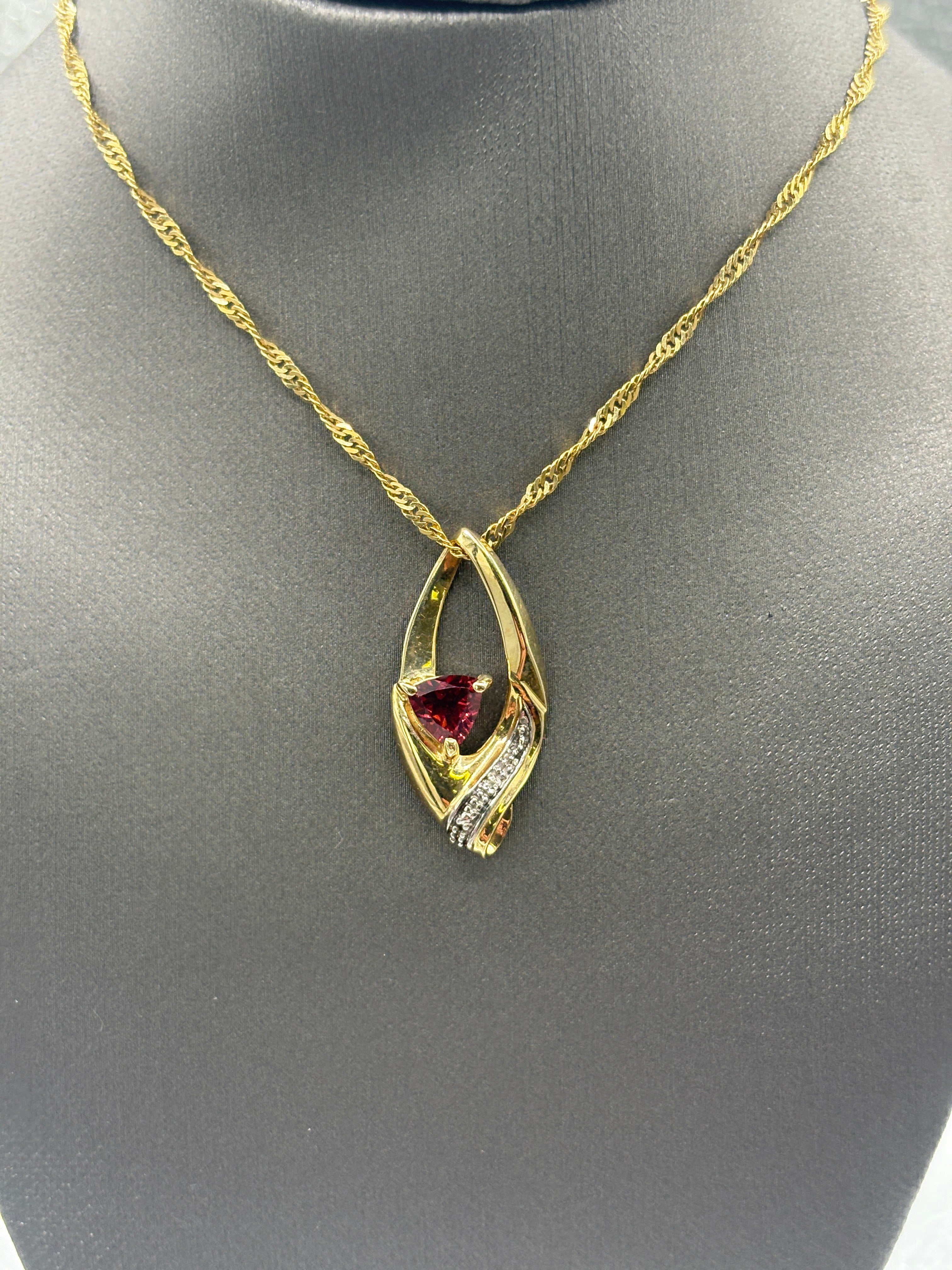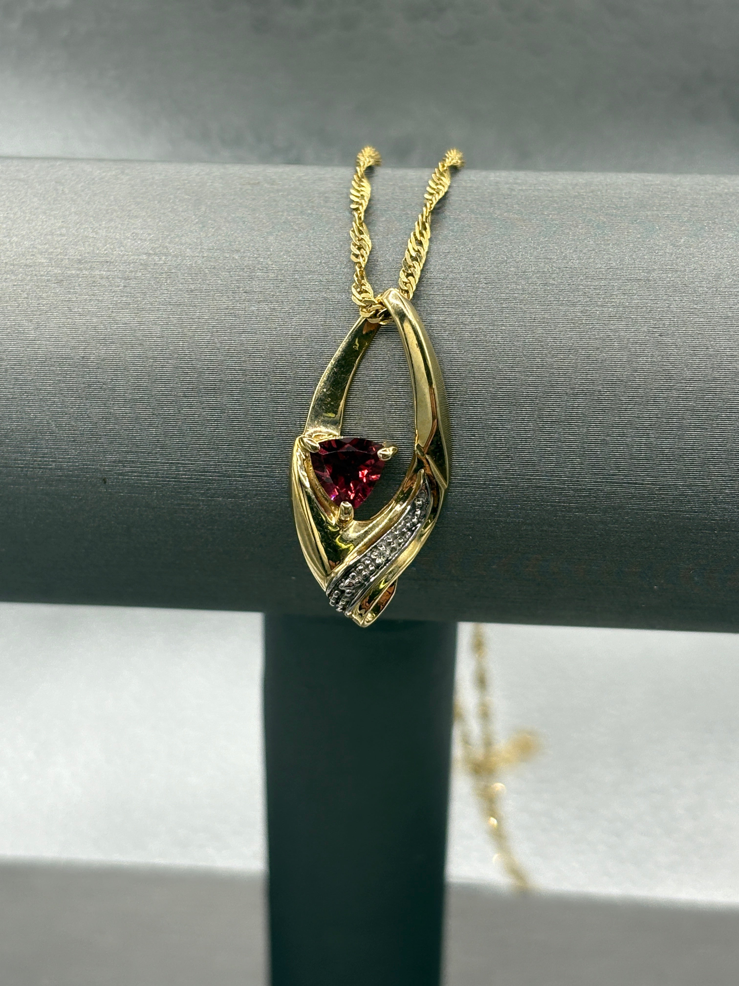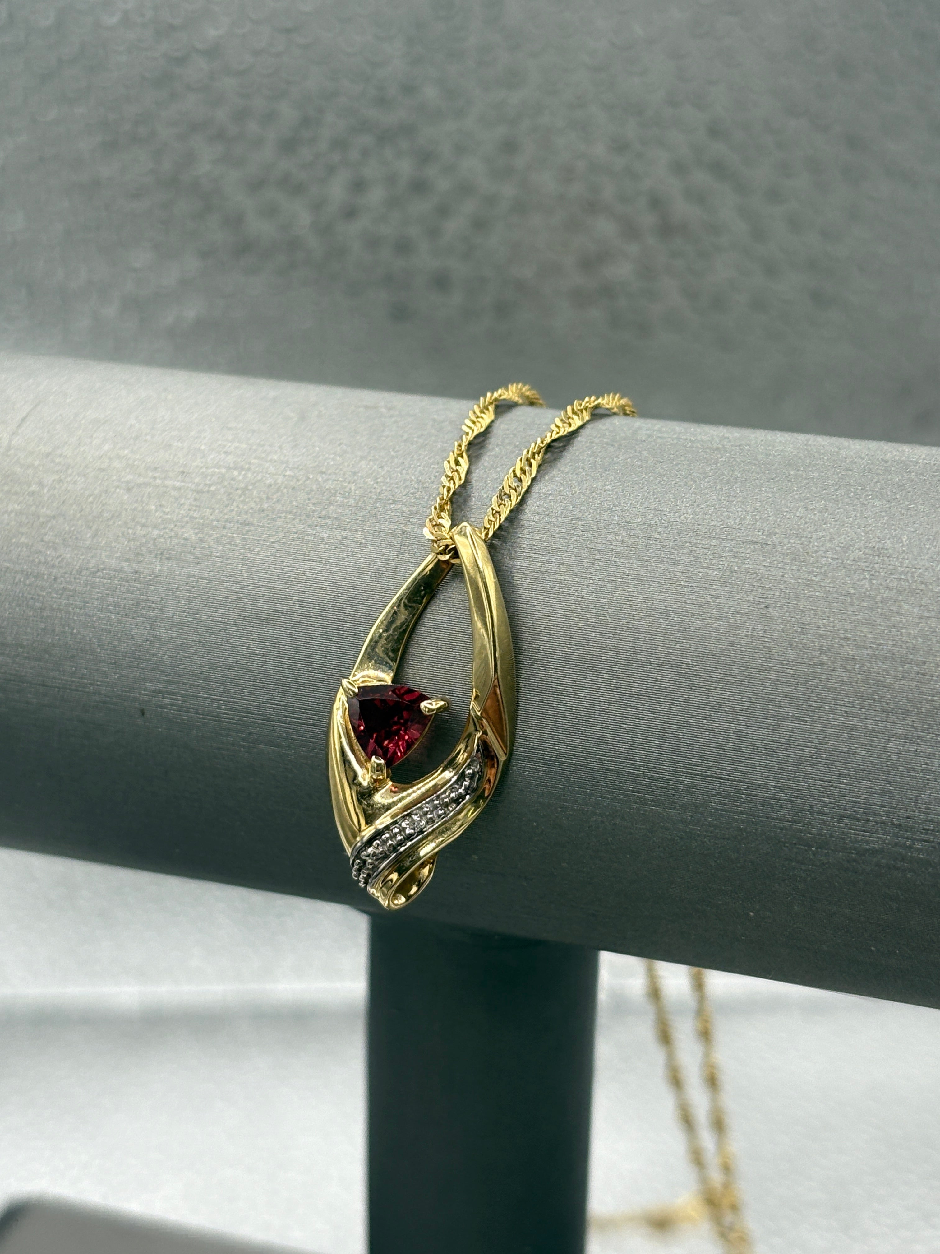 A beautiful Garnet and Diamond pendant designed and made in 10 karat solid yellow gold. The beautiful contour of the gold design with diamond accents accentuates the trillion cut garnet! Looks great on any chain.