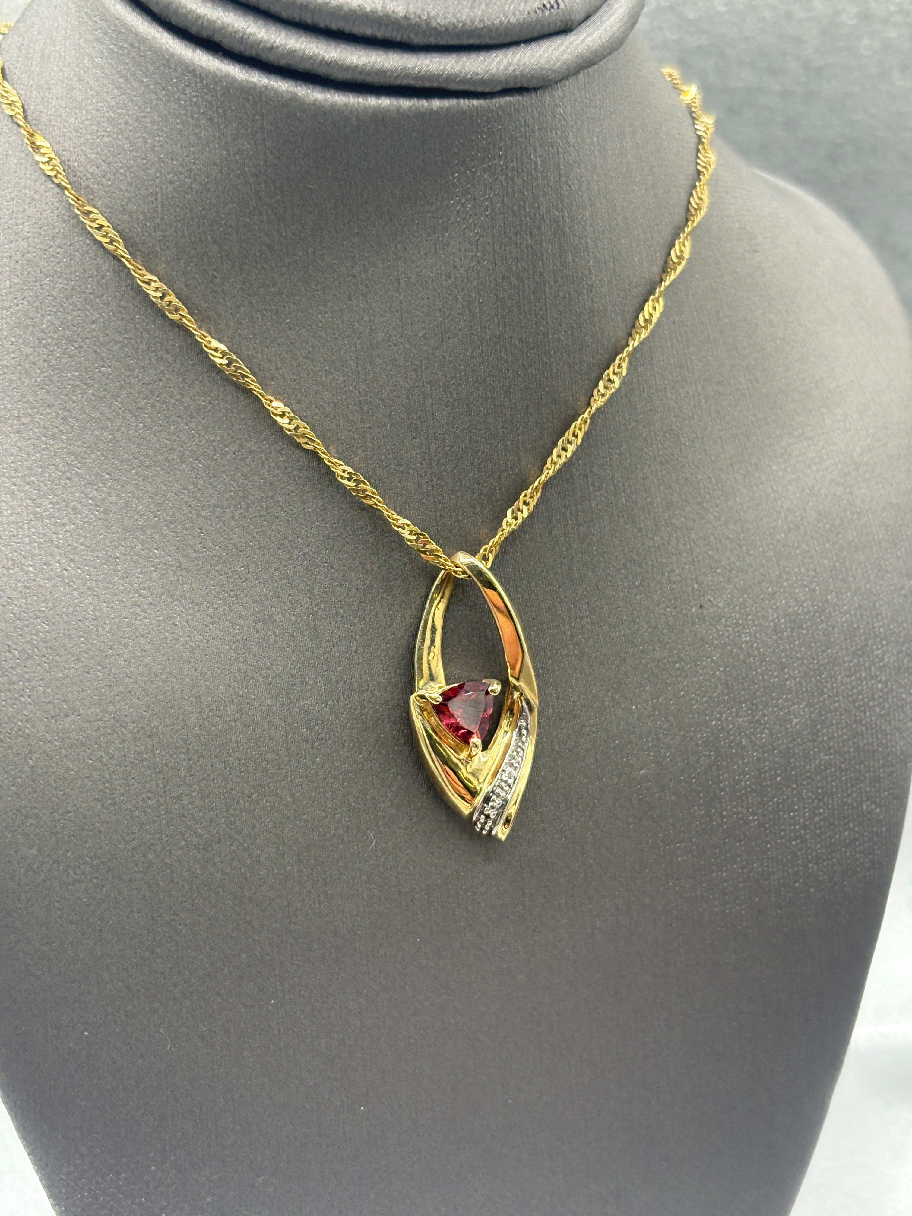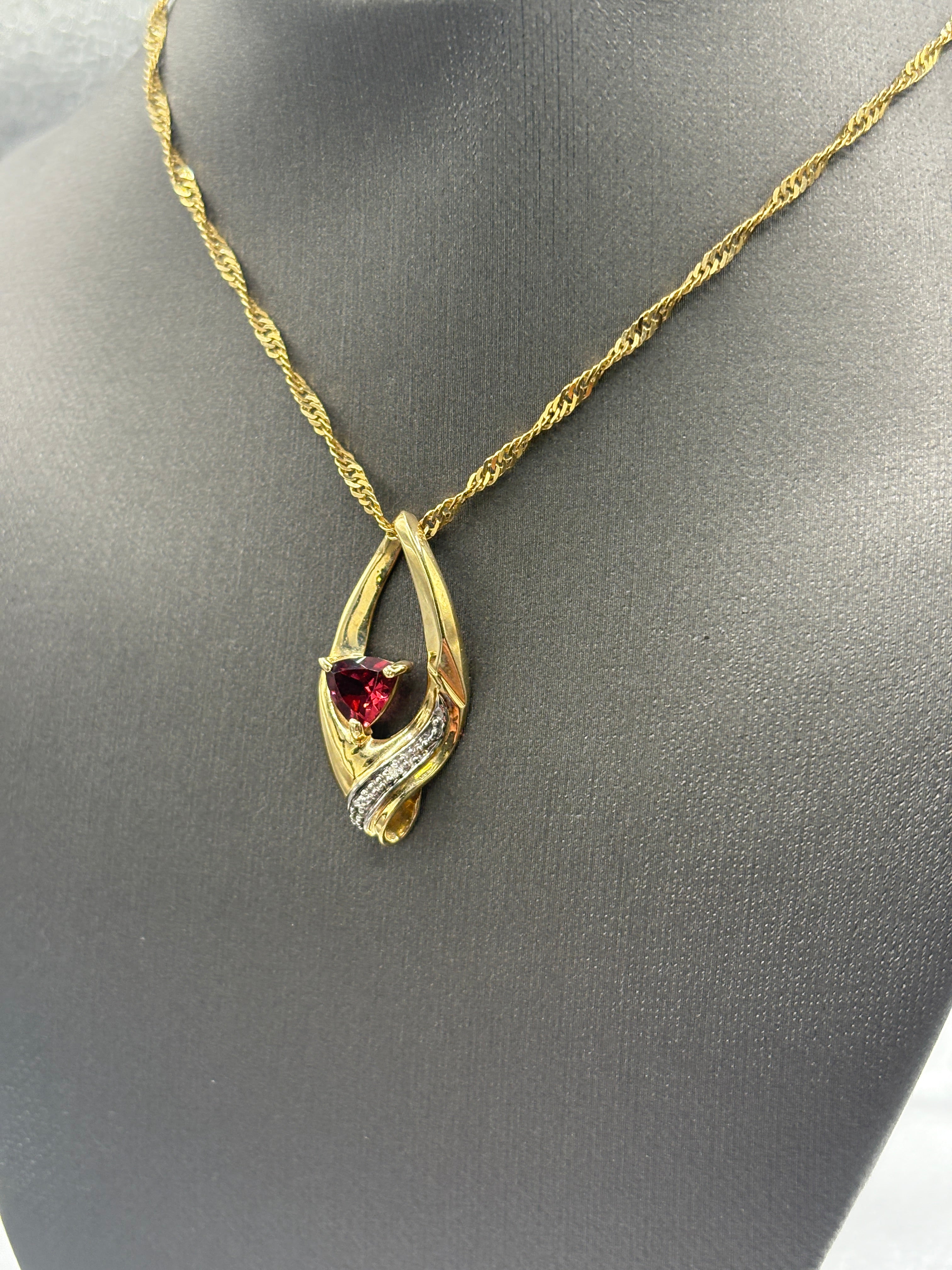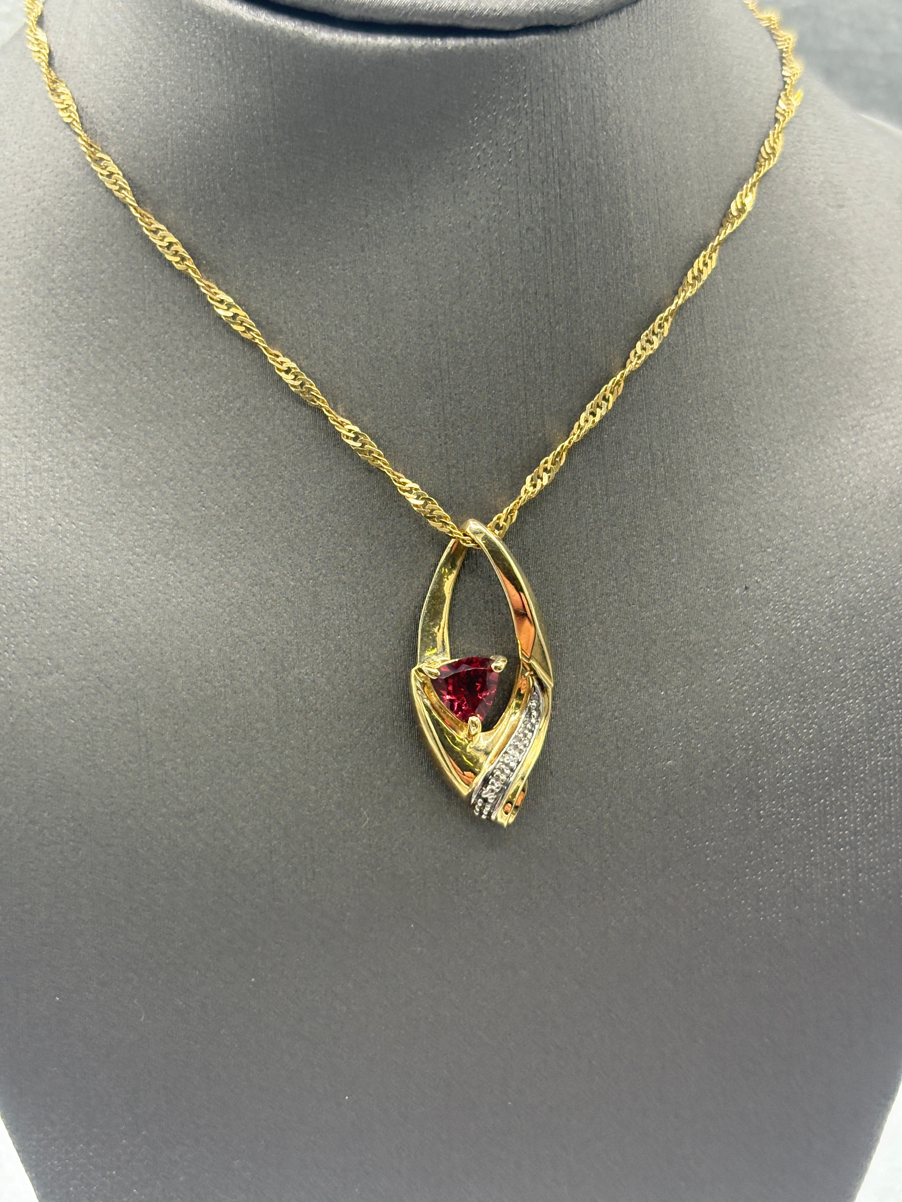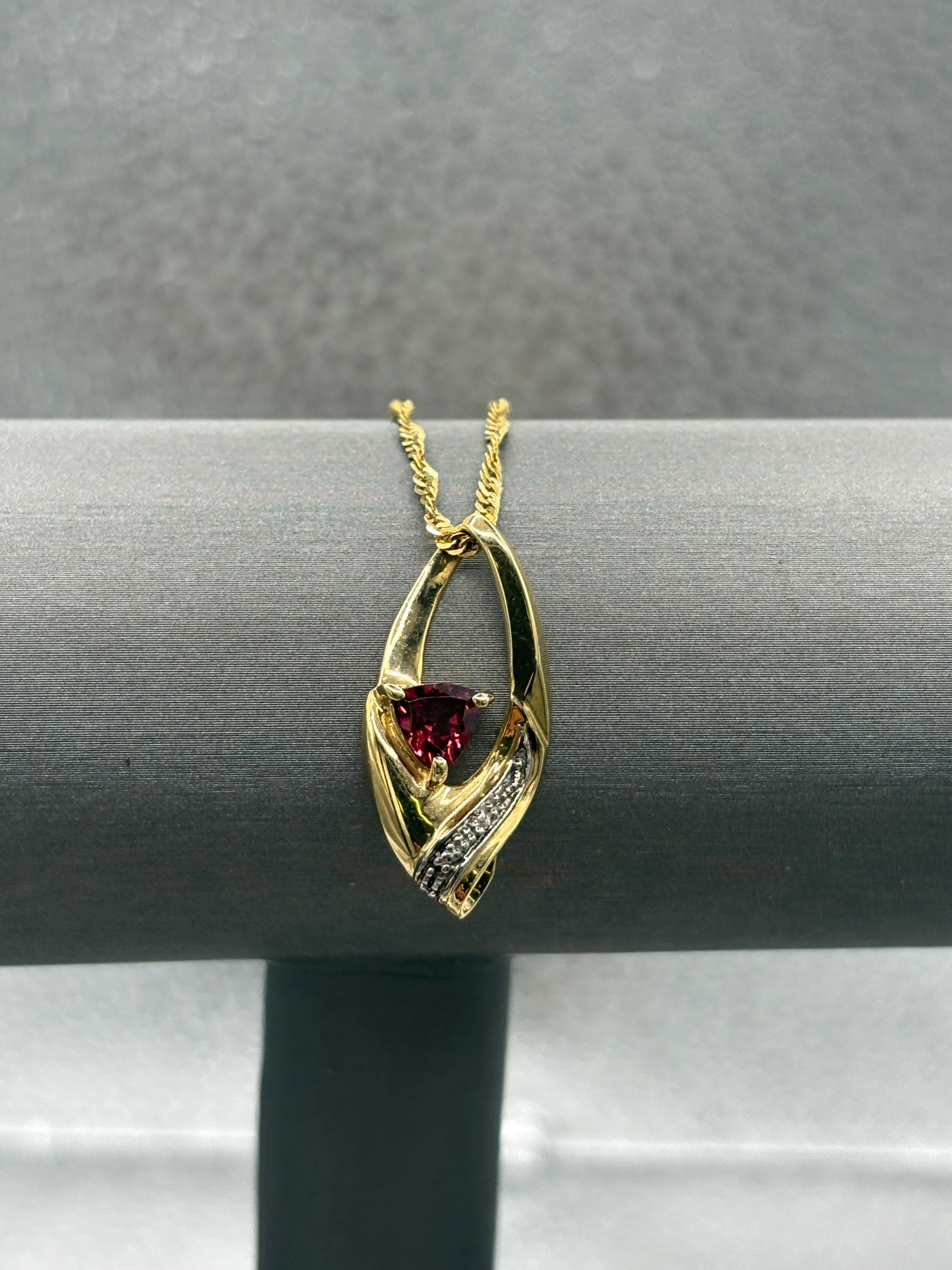 A beautiful Garnet and Diamond pendant designed and made in 10 karat solid yellow gold. The beautiful contour of the gold design with diamond accents accentuates the trillion cut garnet! Looks great on any chain.