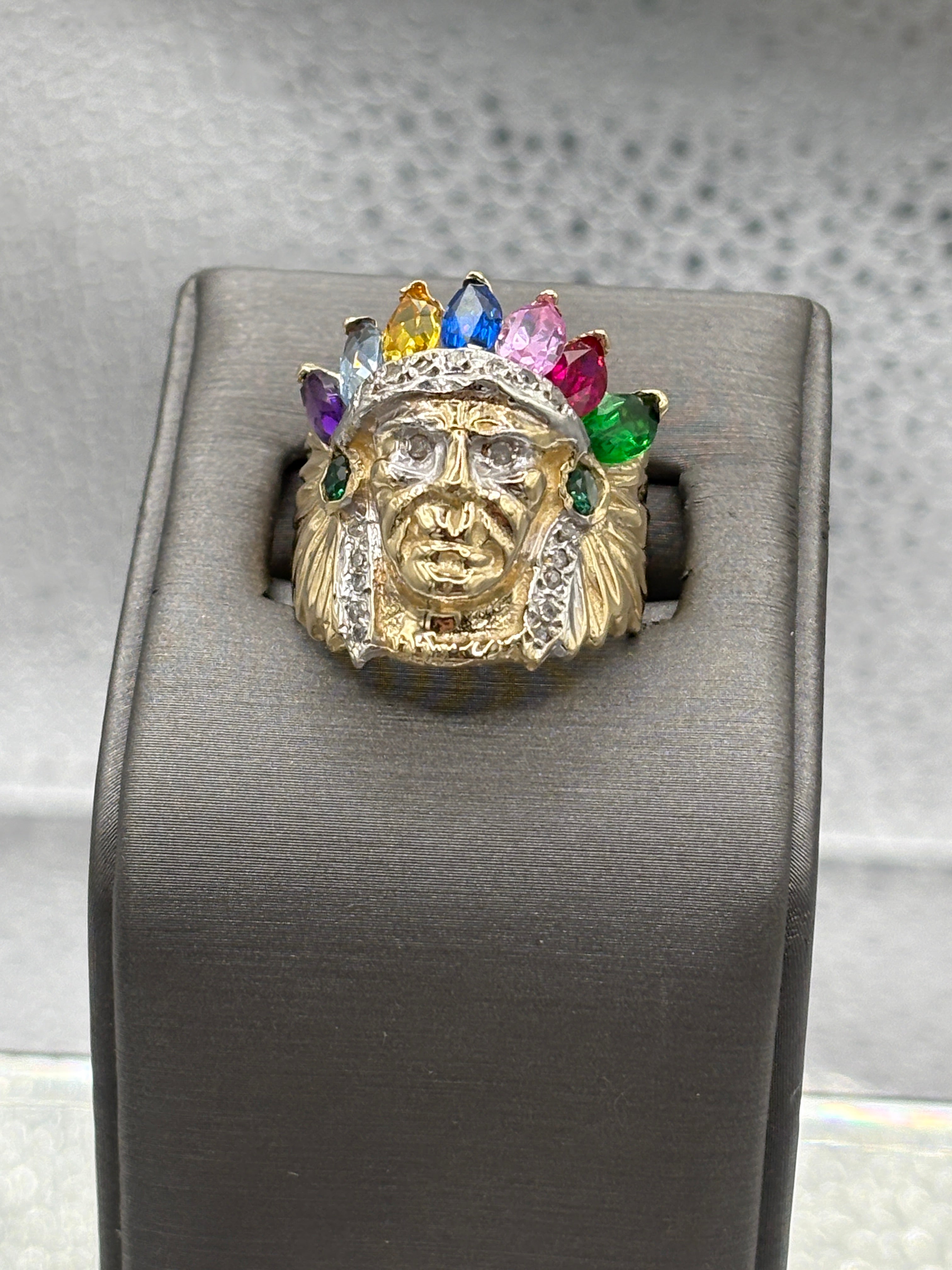 The ring’s design of Native American chiefs wearing feather headdresses, rendered in gold and colorful gemstones makes a statement and shows the quality of a fine piece of vintage jewelry designed and made in 14 karat solid yellow gold.  This ring has a lot of spirit.