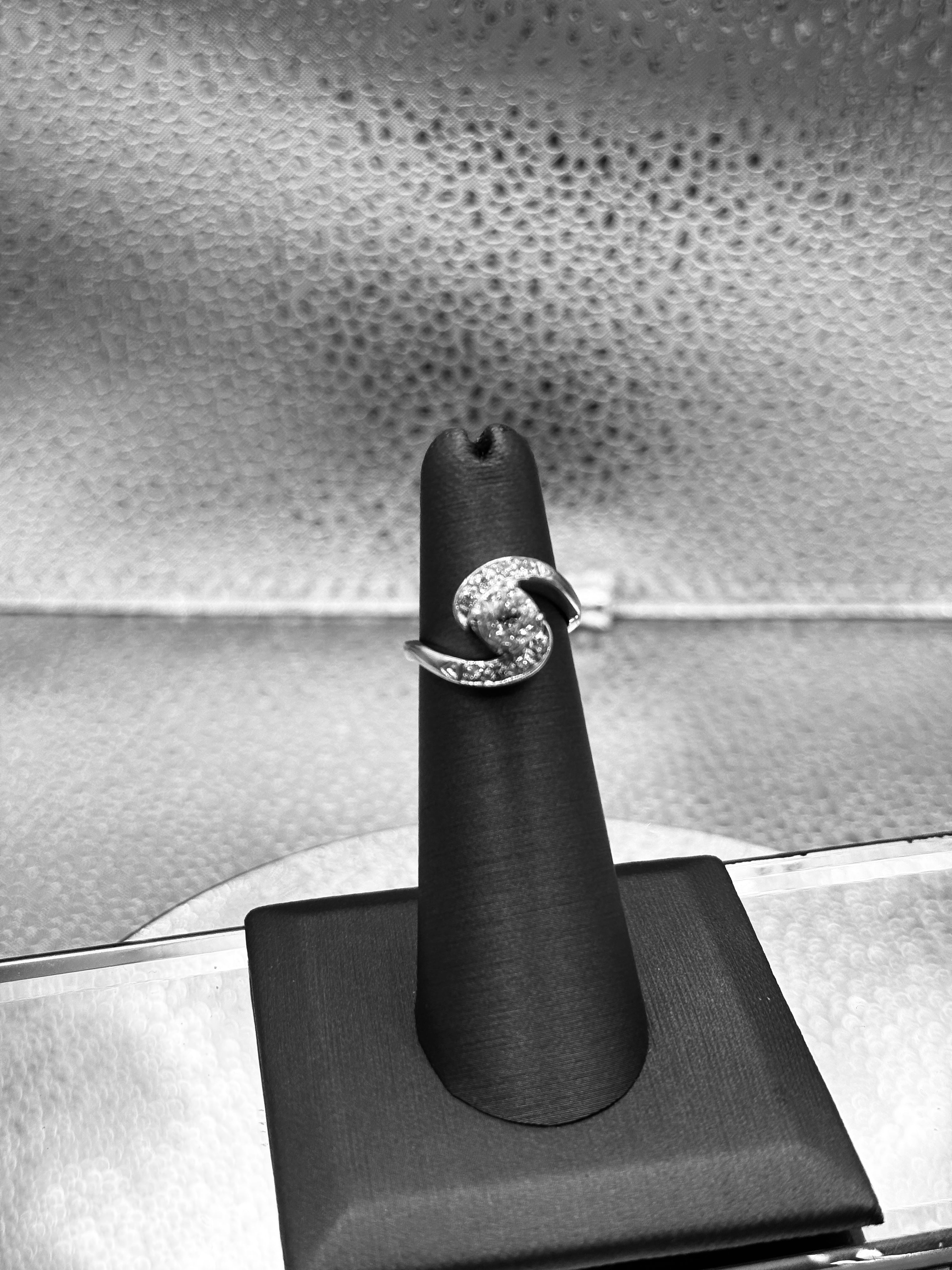 This diamond swirl or tourbillon style was designed and made in 90% Platinum. This classic design became popular in the late 19th century. The ring showcases small diamonds set in a graceful swirl or spiral pattern, creating an elegant flowing design. The swirl pattern,symbolizes eternity and continuous movement. A gorgeous ring for any woman!