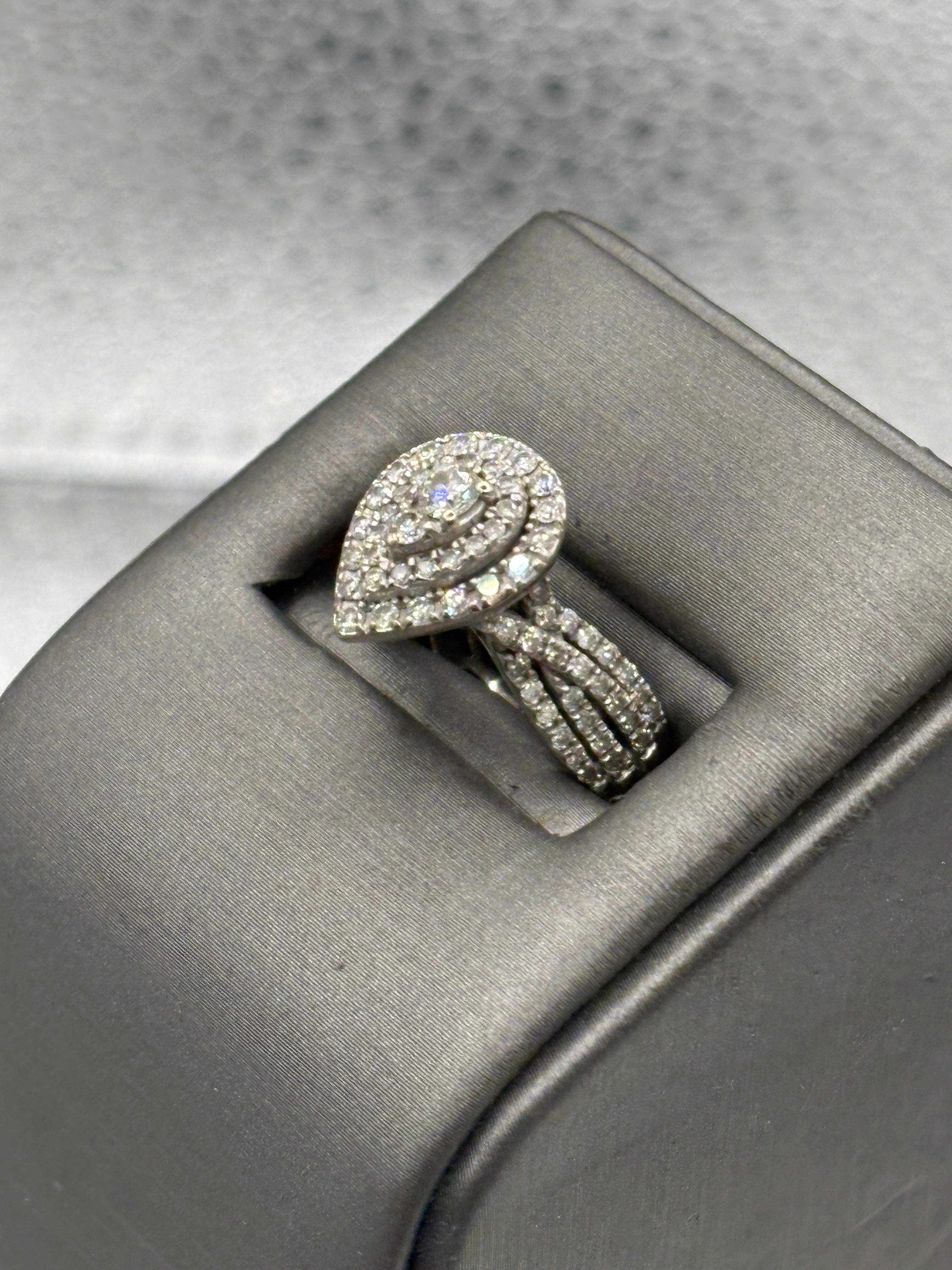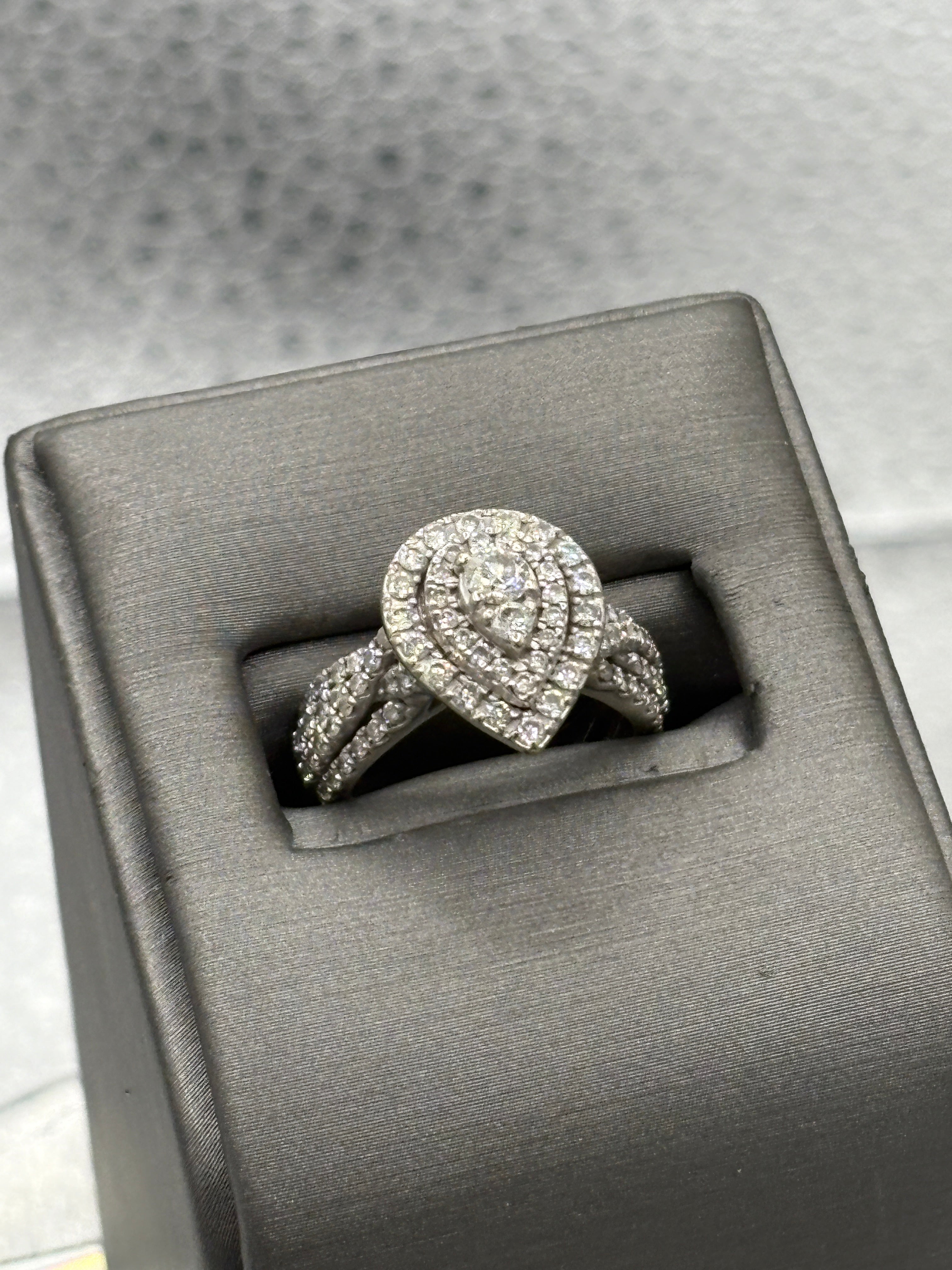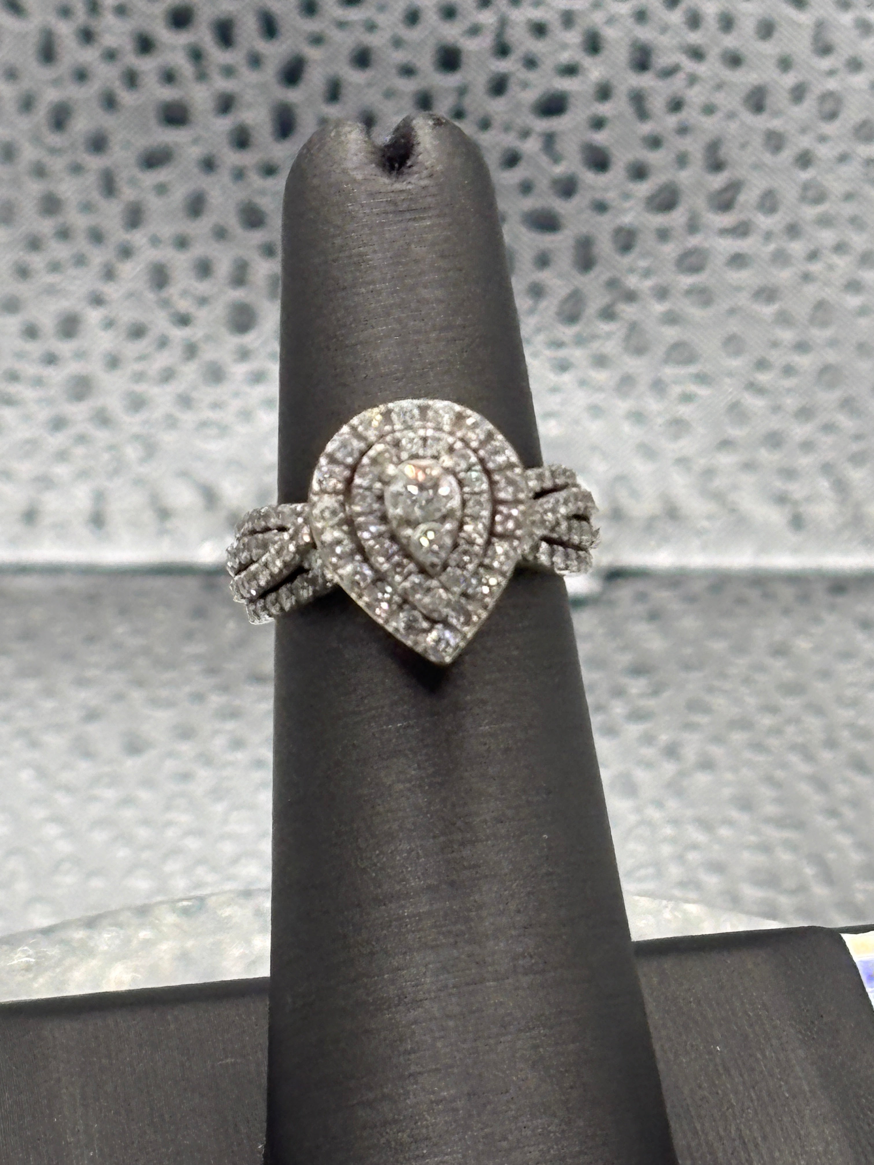 Ladies 14 Karat White Gold Teardrop Triple Diamond Halo Ring