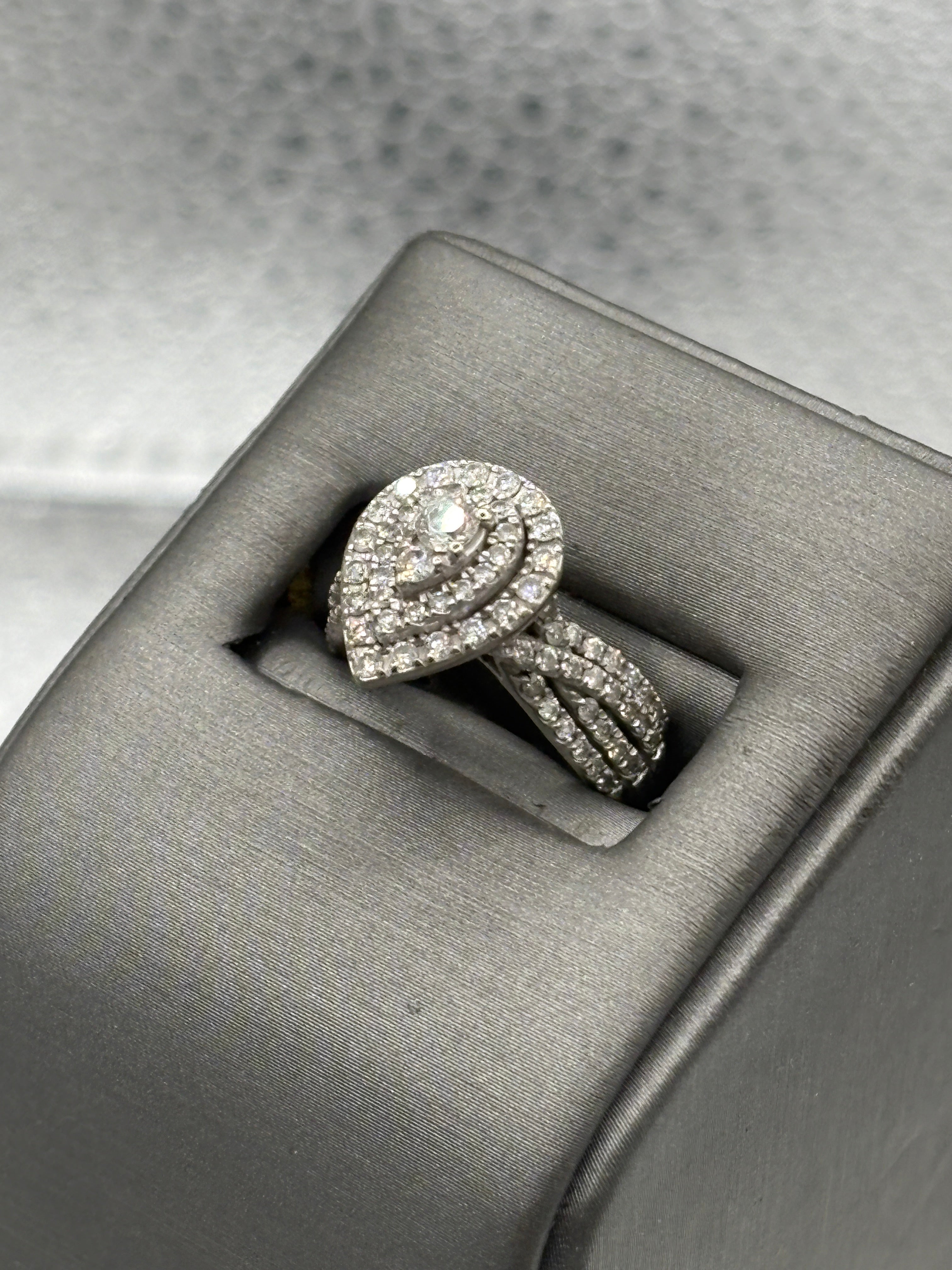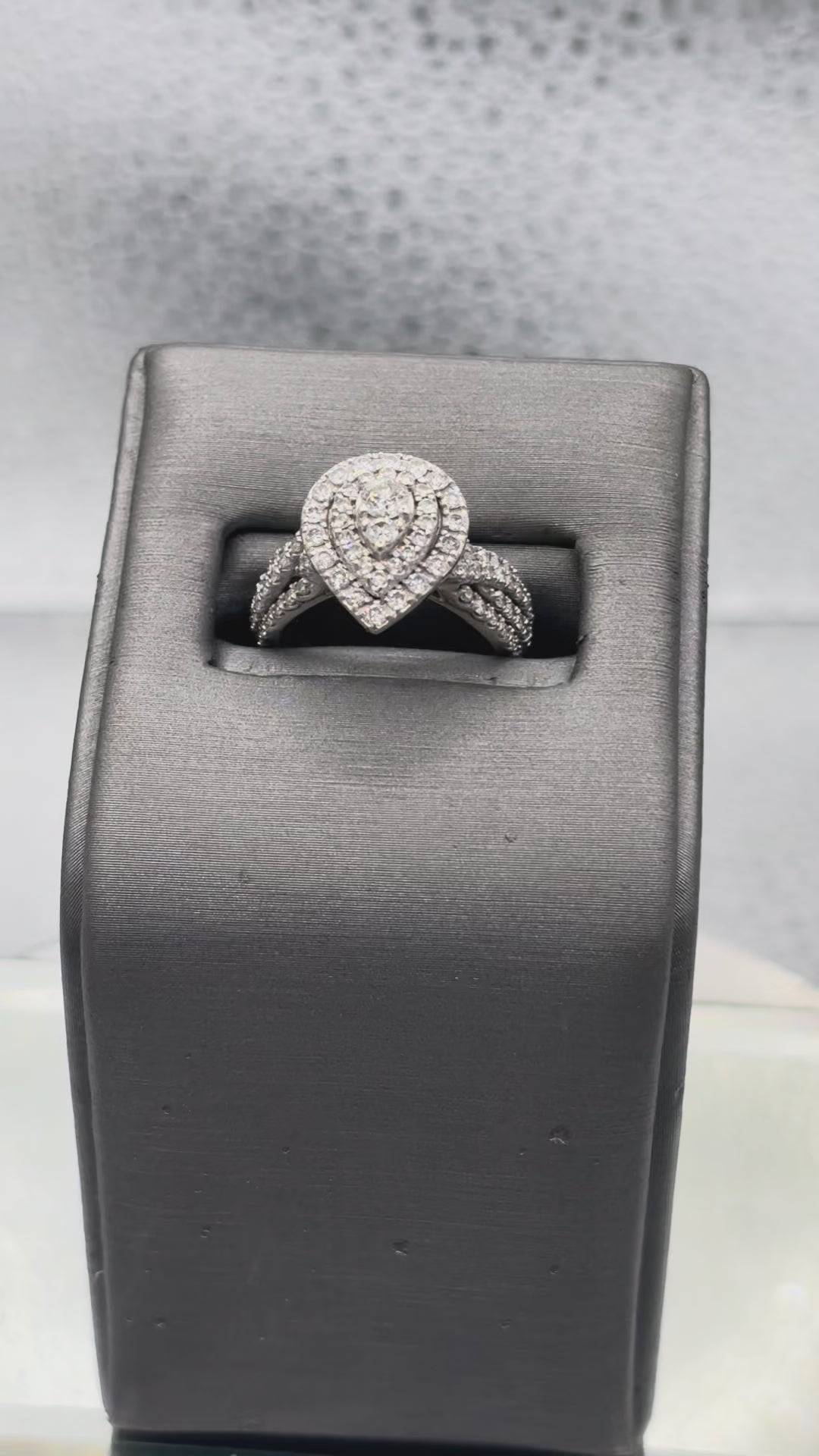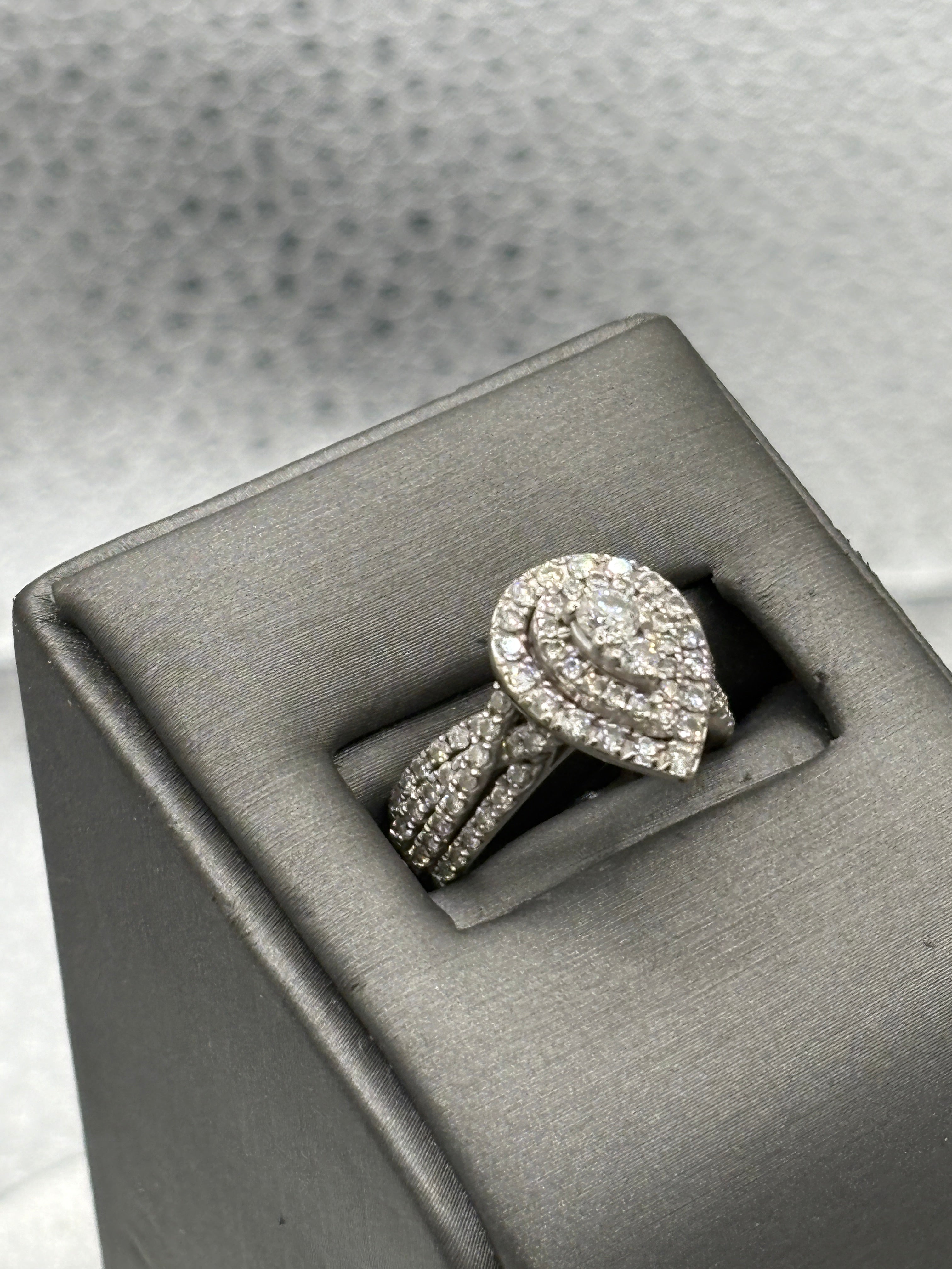 Ladies 14 Karat White Gold Teardrop Triple Diamond Halo Ring