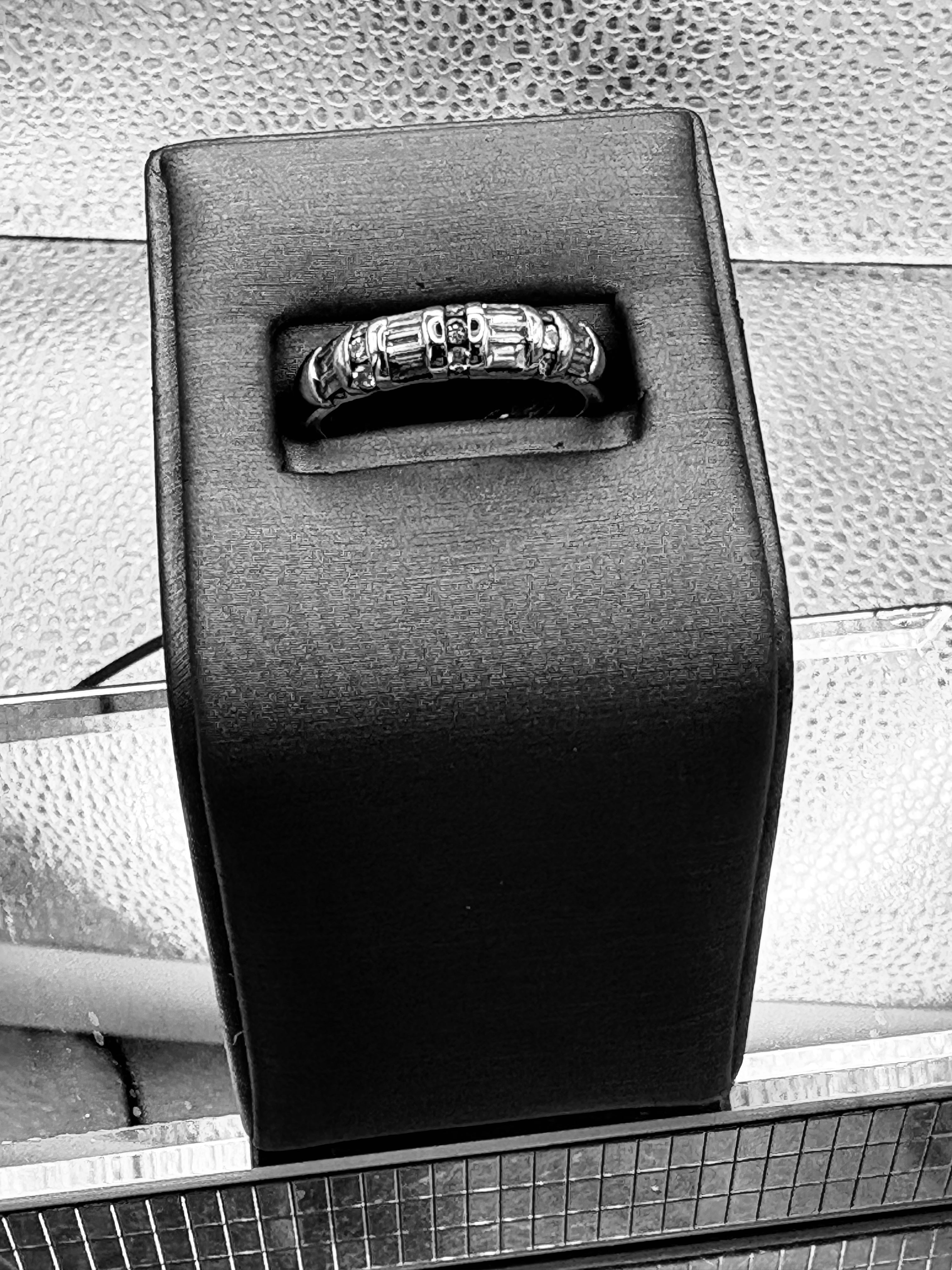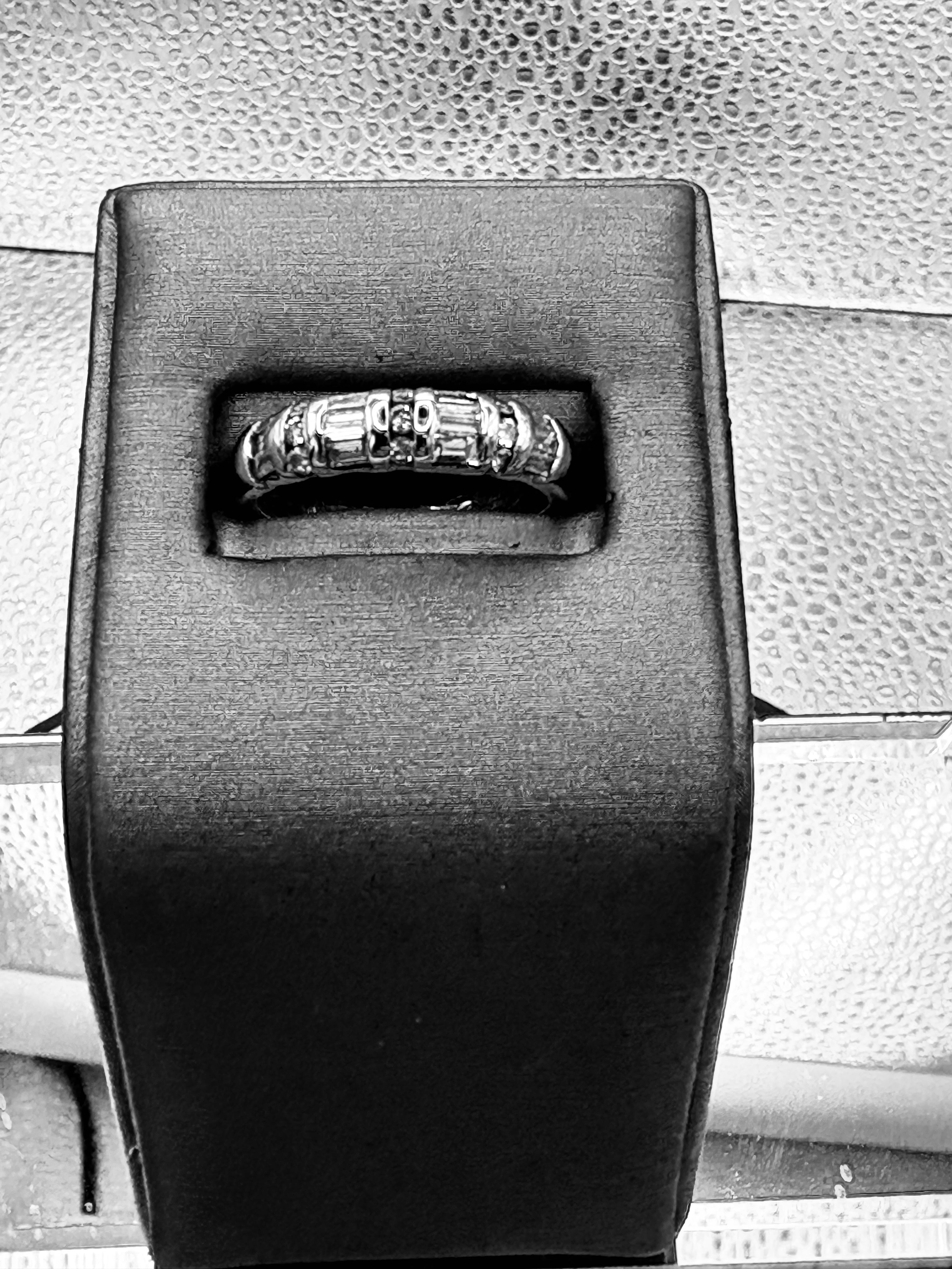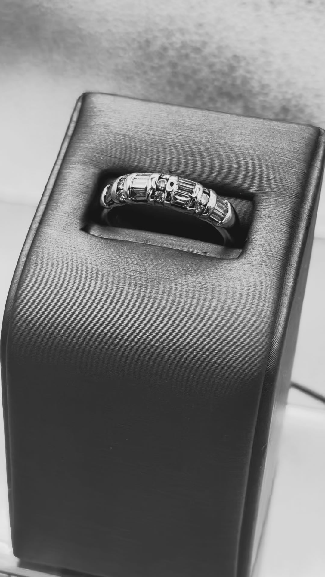 This gorgeous diamond wedding band features a classic channel set design with alternating baguette and round diamonds set in 14 karat solid white gold. The ring showcases the popular combination of baguette and round diamonds, which creates an elegant, timeless design that continues to be valued in both the vintage and contemporary jewelry markets. It’s gorgeous on the hand!