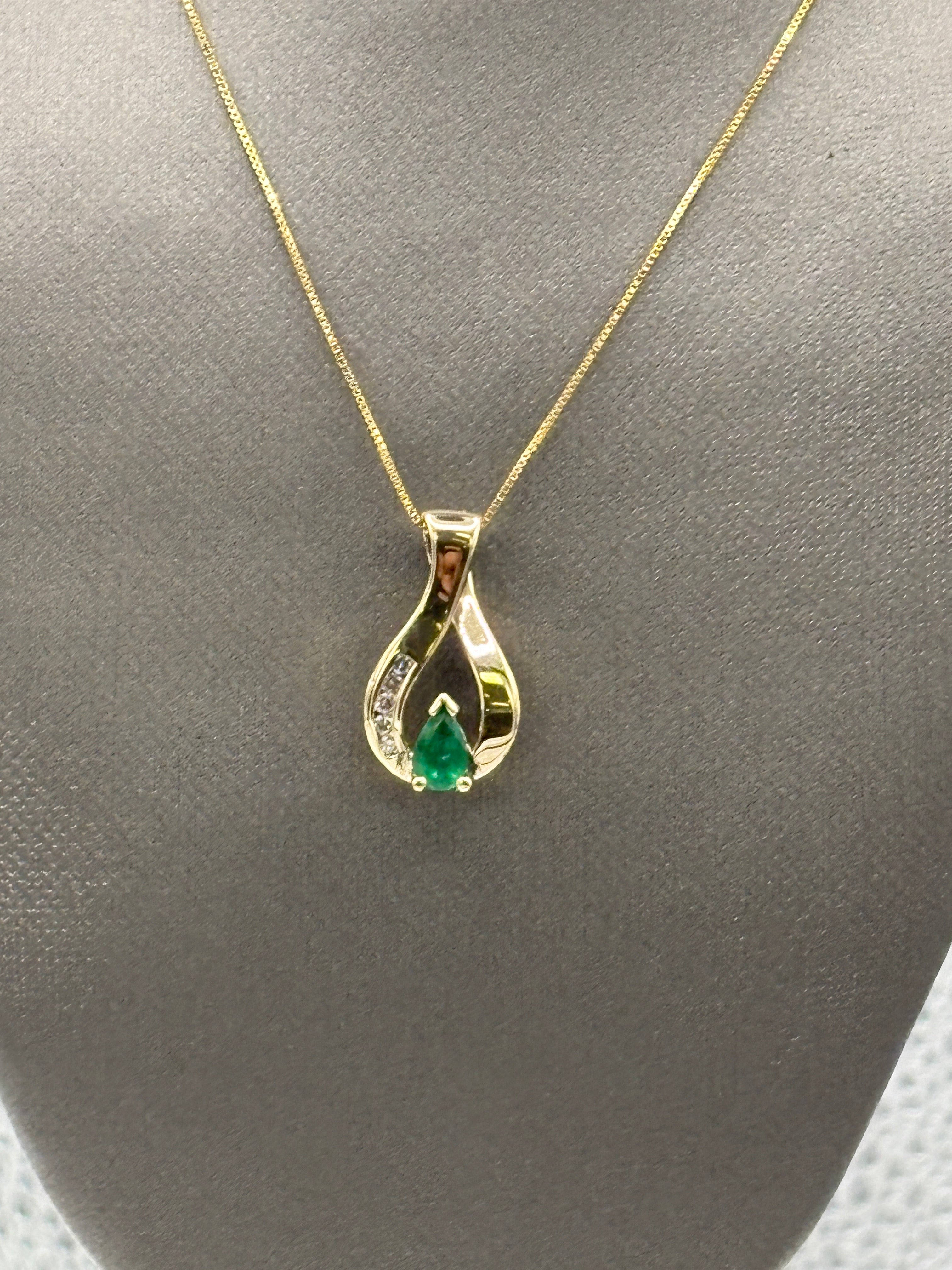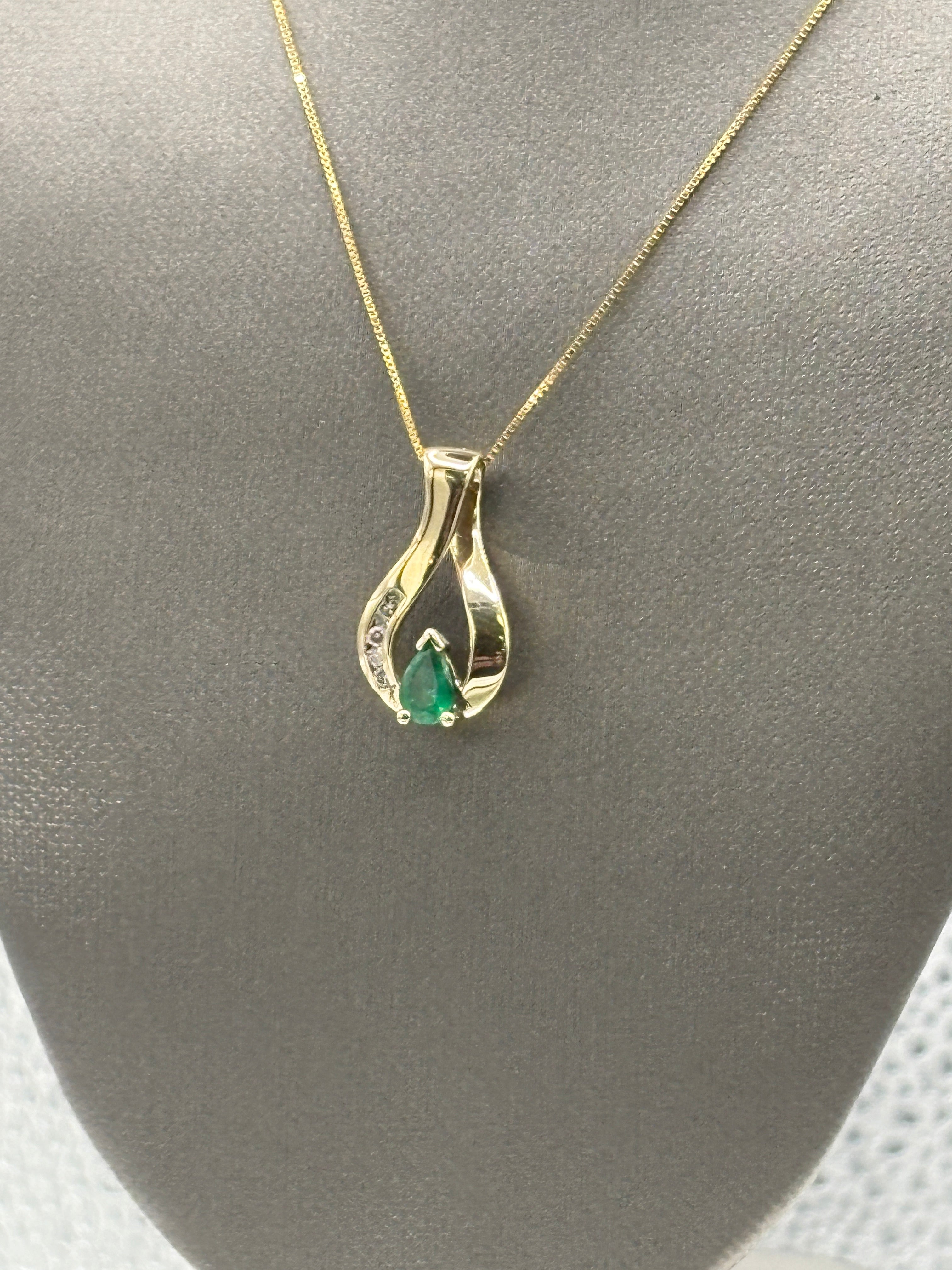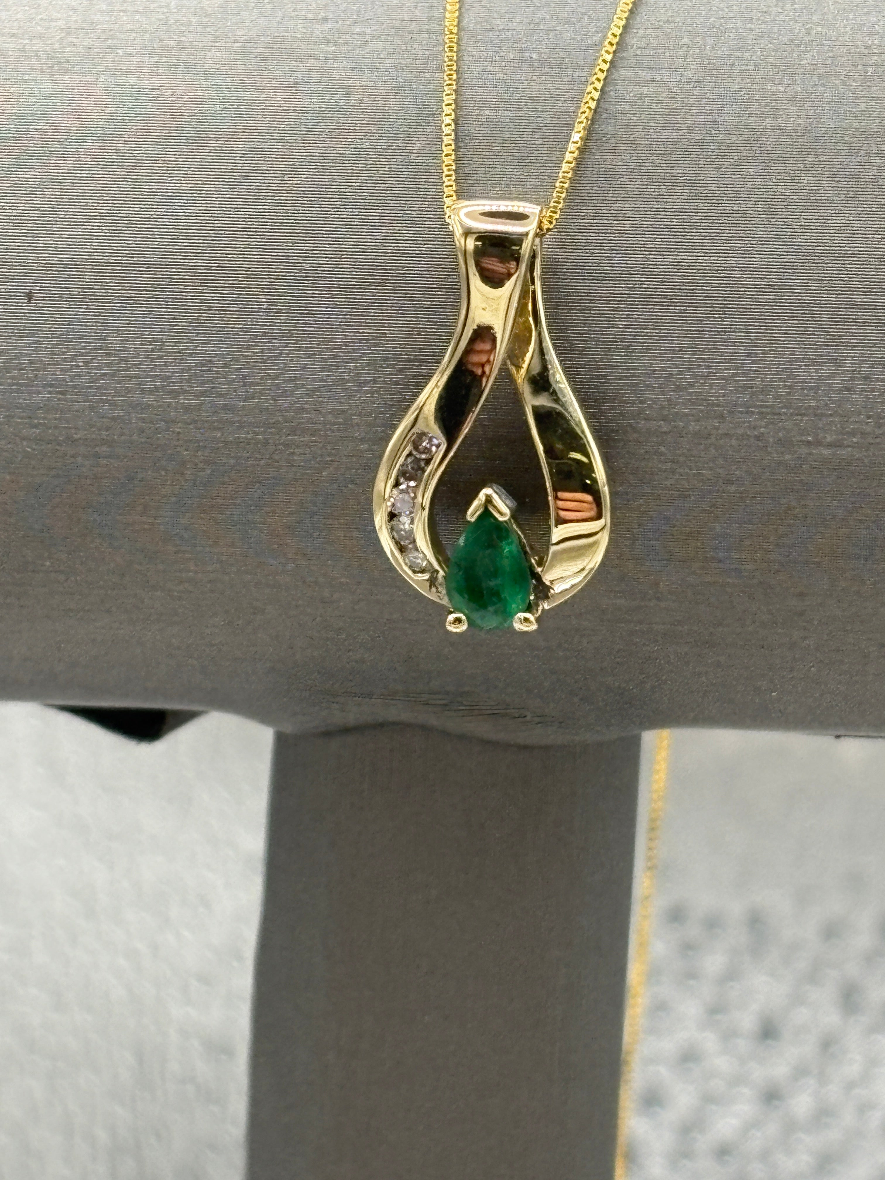 This pendant features a pair shaped emerald set in 14 karat yellow gold teardrop design with beautiful white diamond accents. Emerald and diamond jewelry have been popular for centuries!