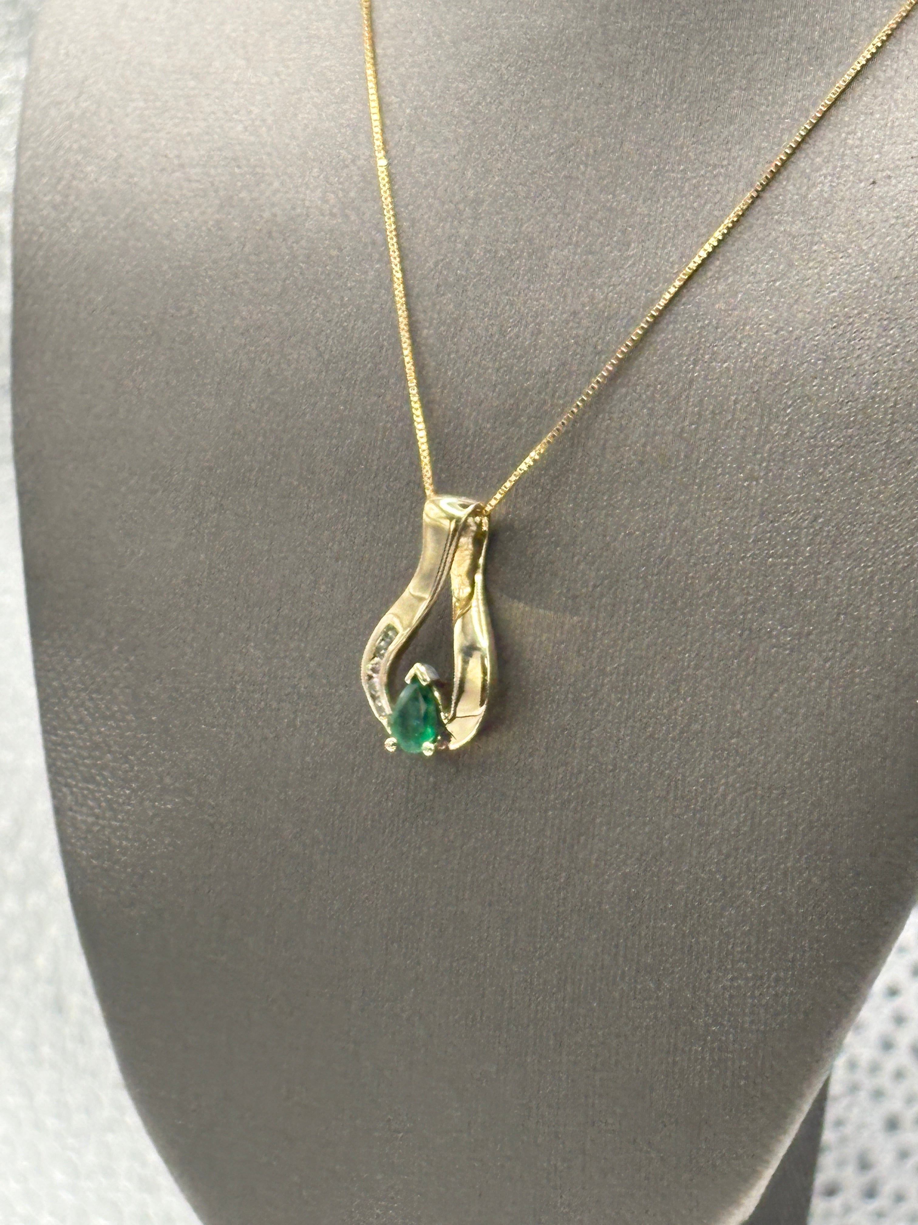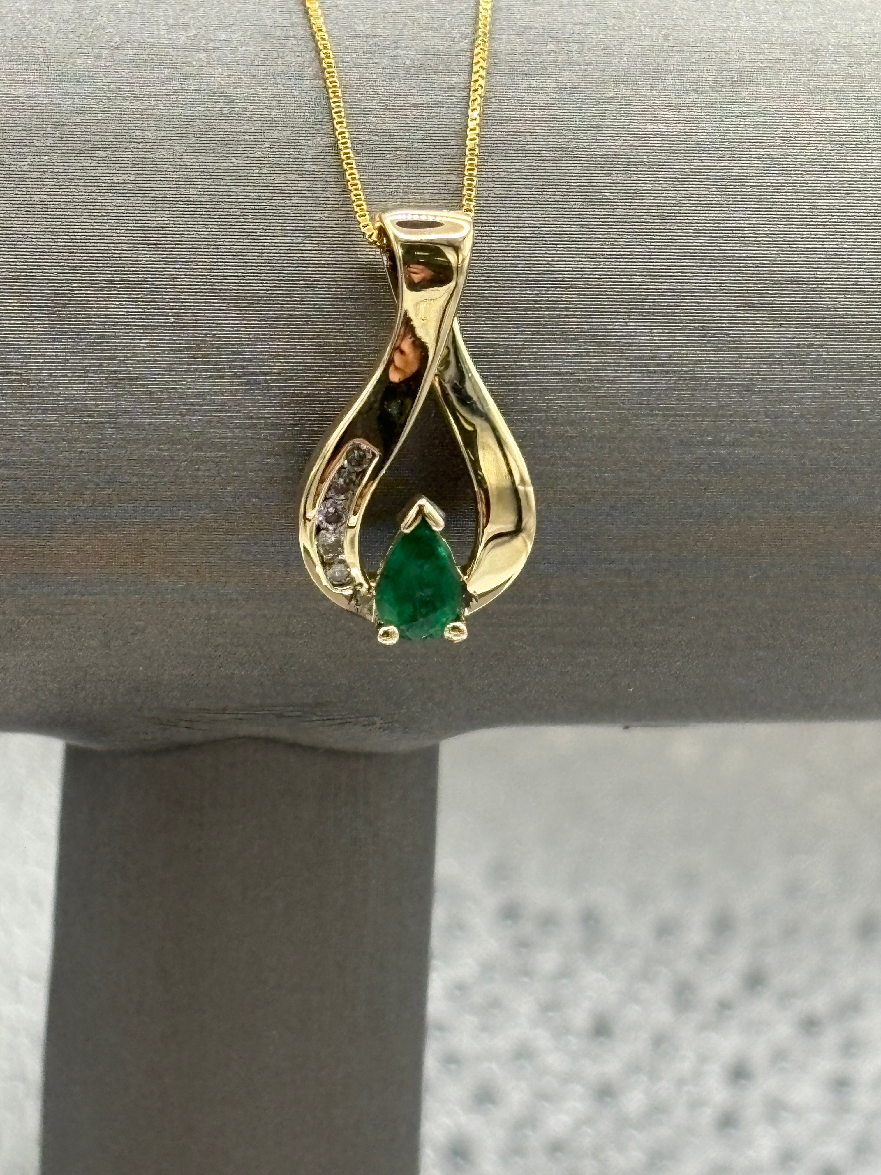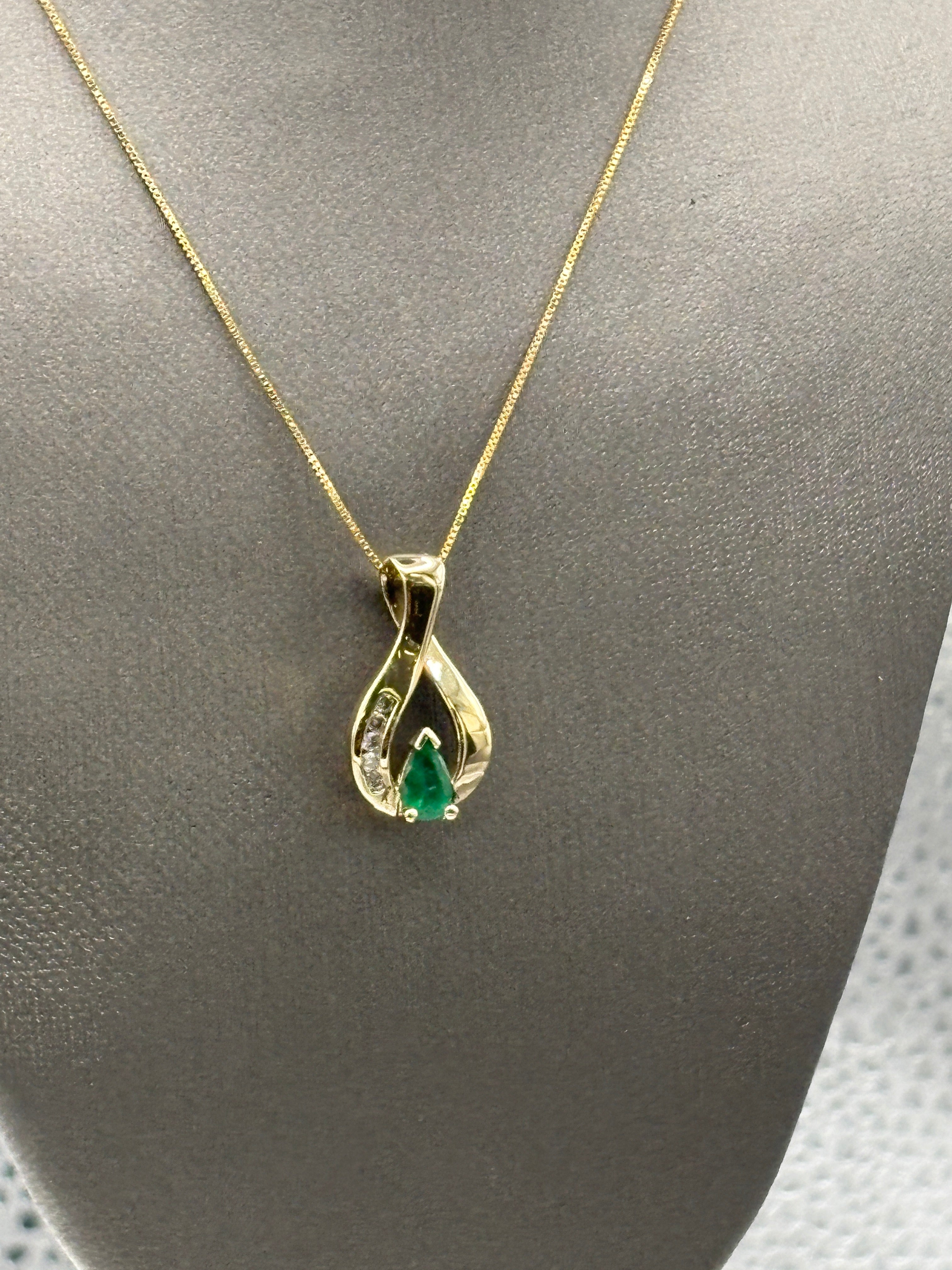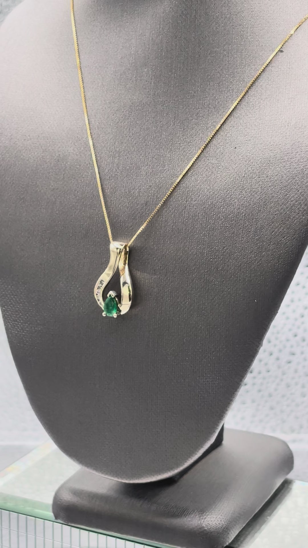 This pendant features a pair shaped emerald set in 14 karat yellow gold teardrop design with beautiful white diamond accents. Emerald and diamond jewelry have been popular for centuries!