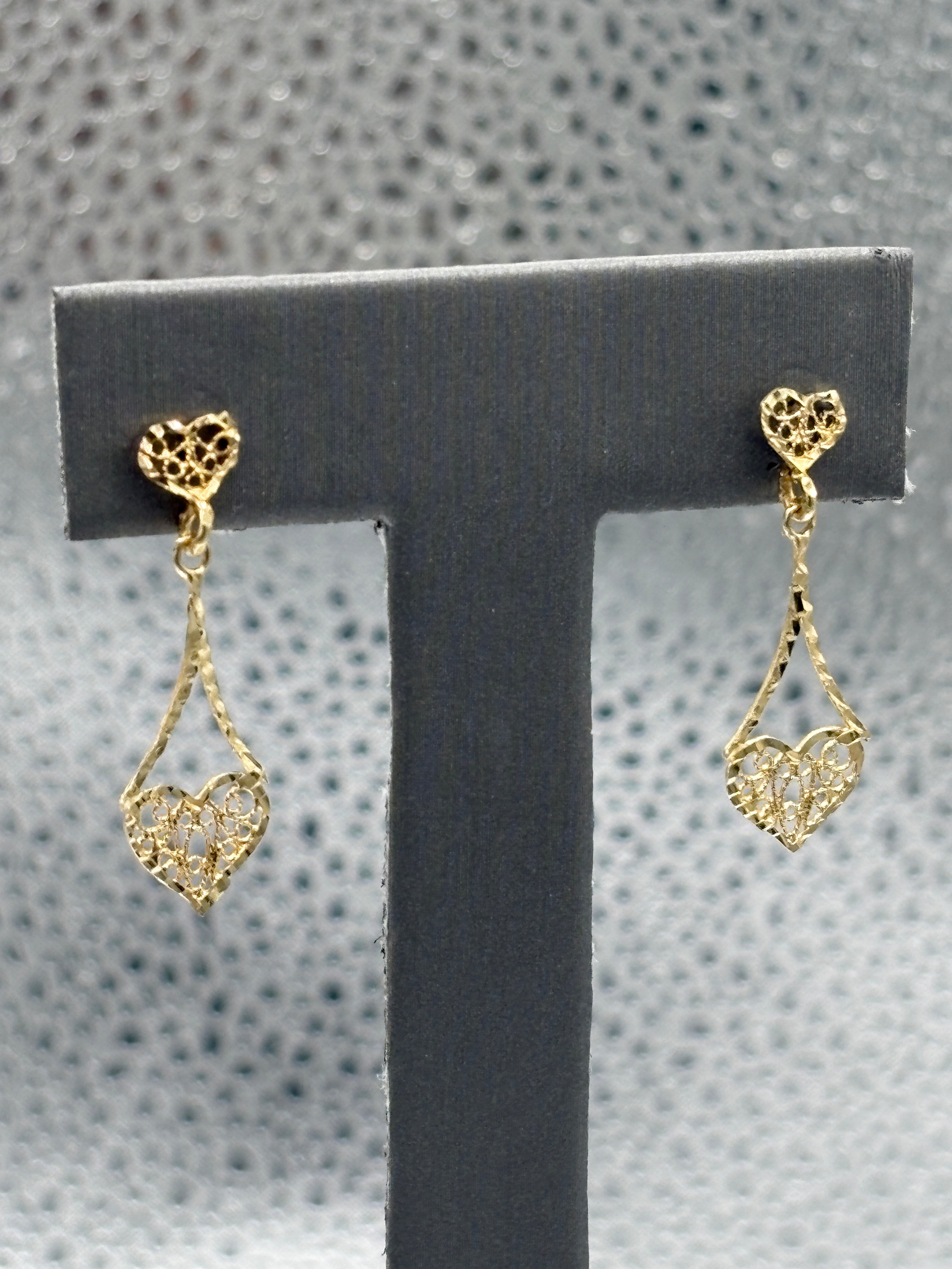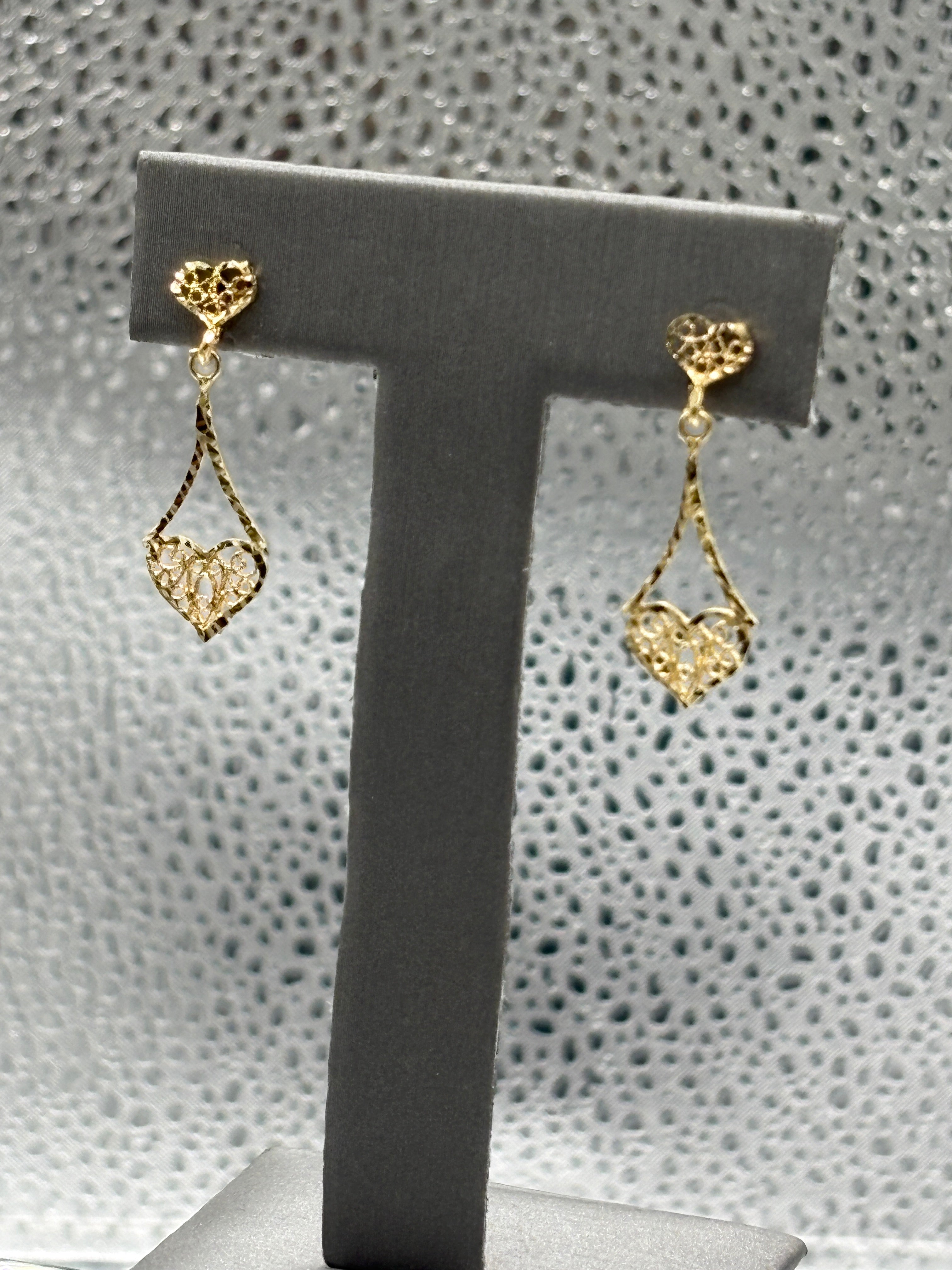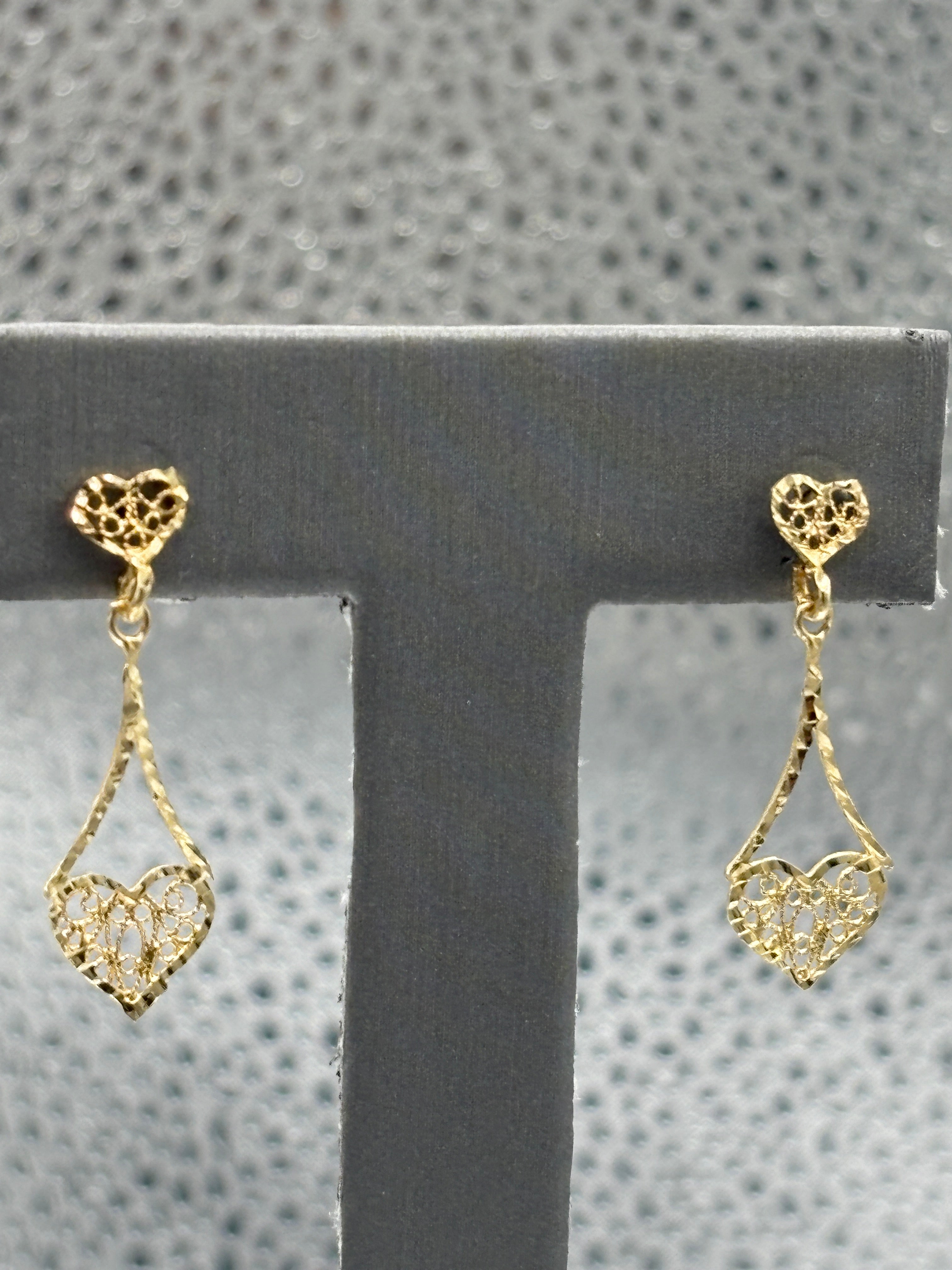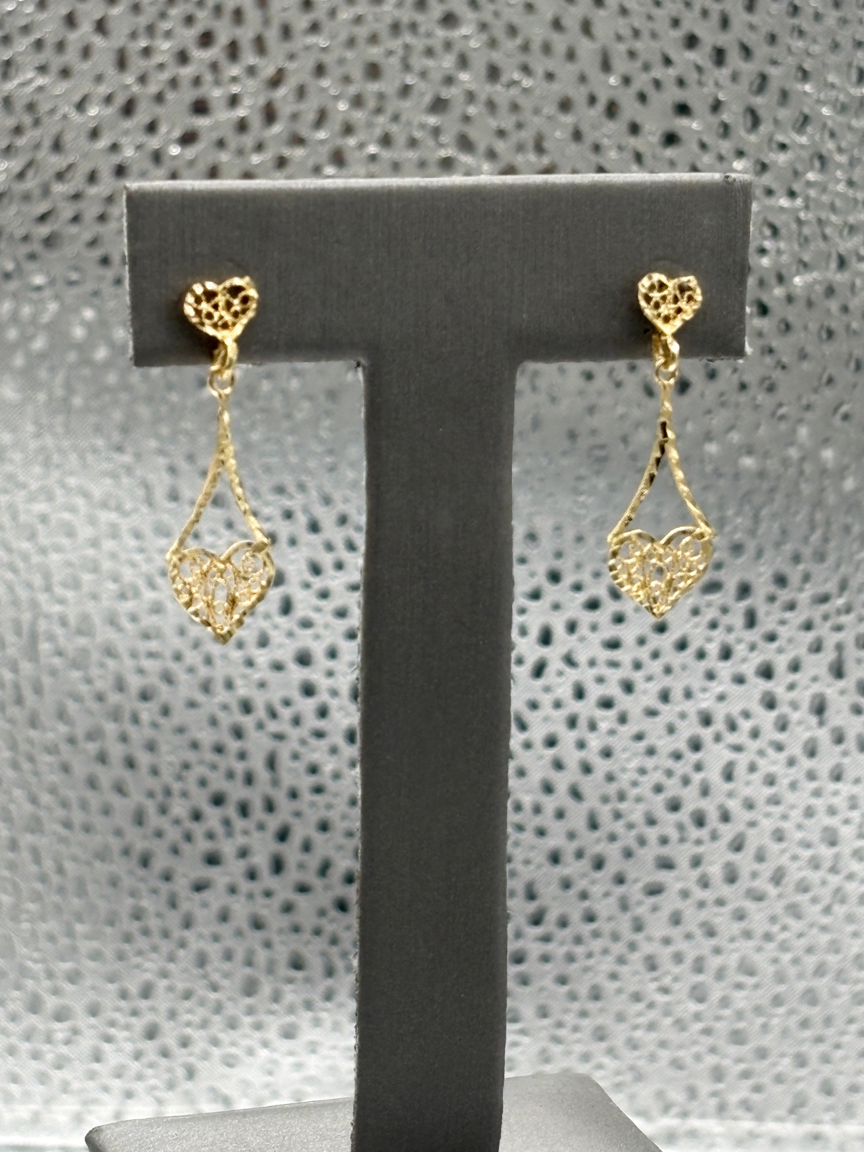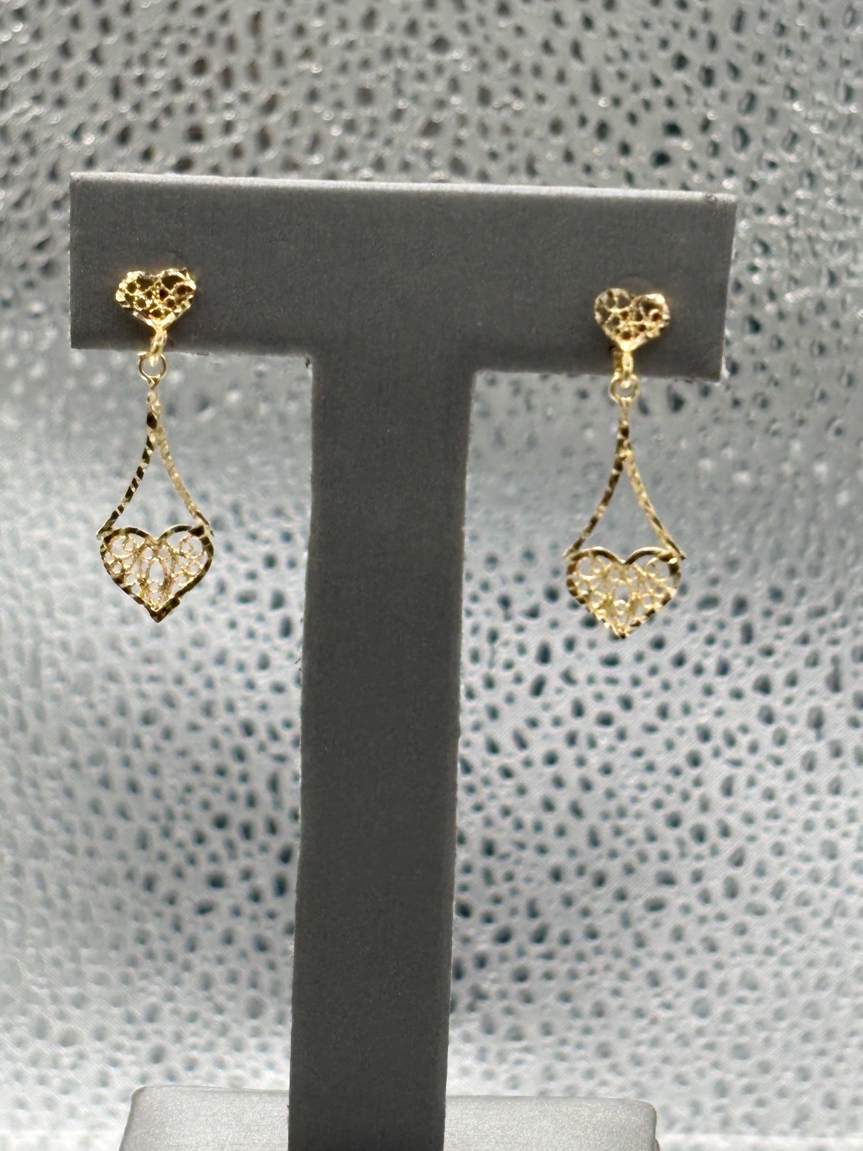 14 Karat Yellow Gold Ladies Filagre Heart Dangling Earrings