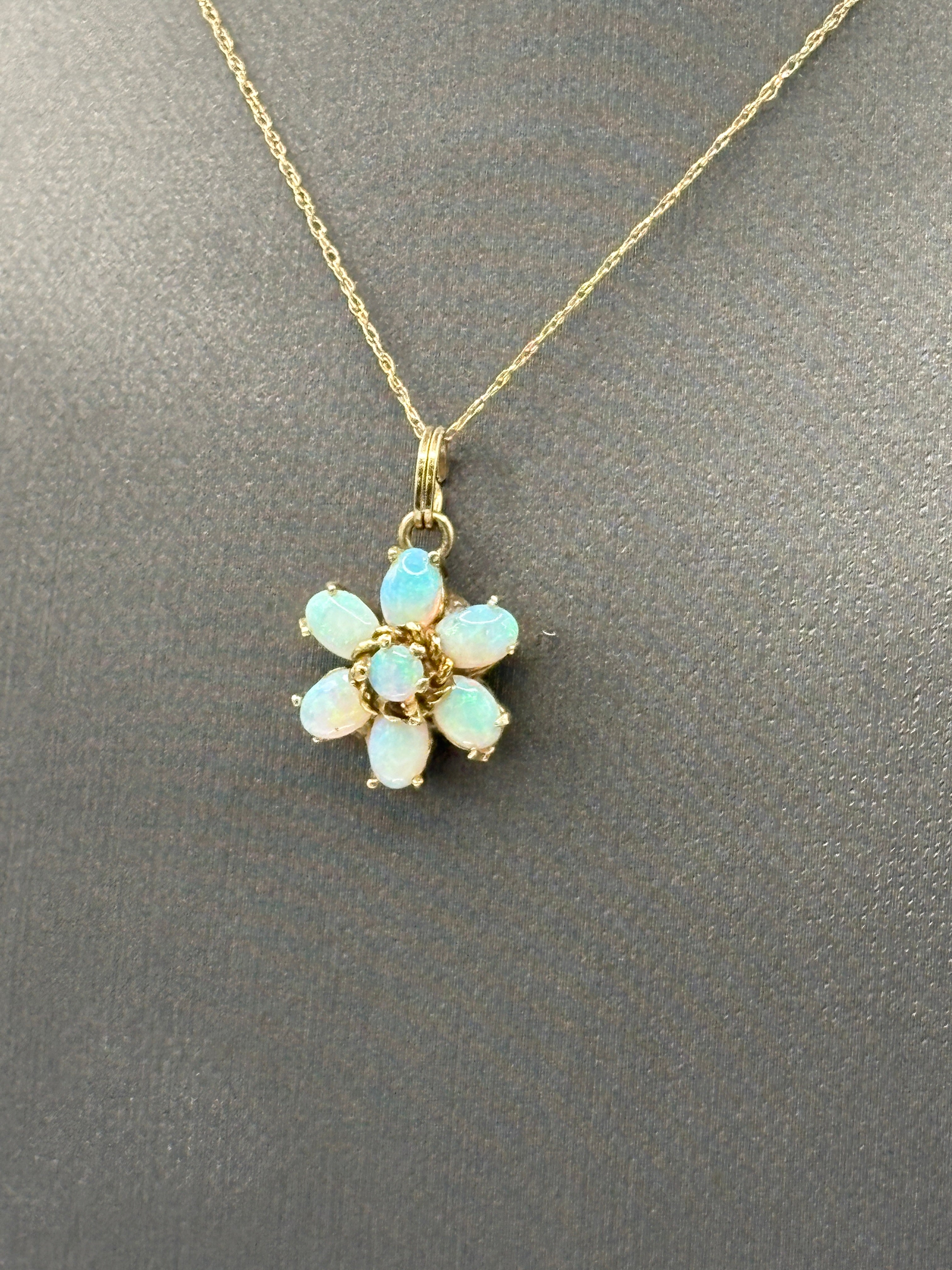 This lovely pendant necklace features a floral design crafted in 14 karat solid yellow gold with oval shaped opals, arranged in a flower pattern. The combination of the ethereal play of color in opals is truly natural beauty!