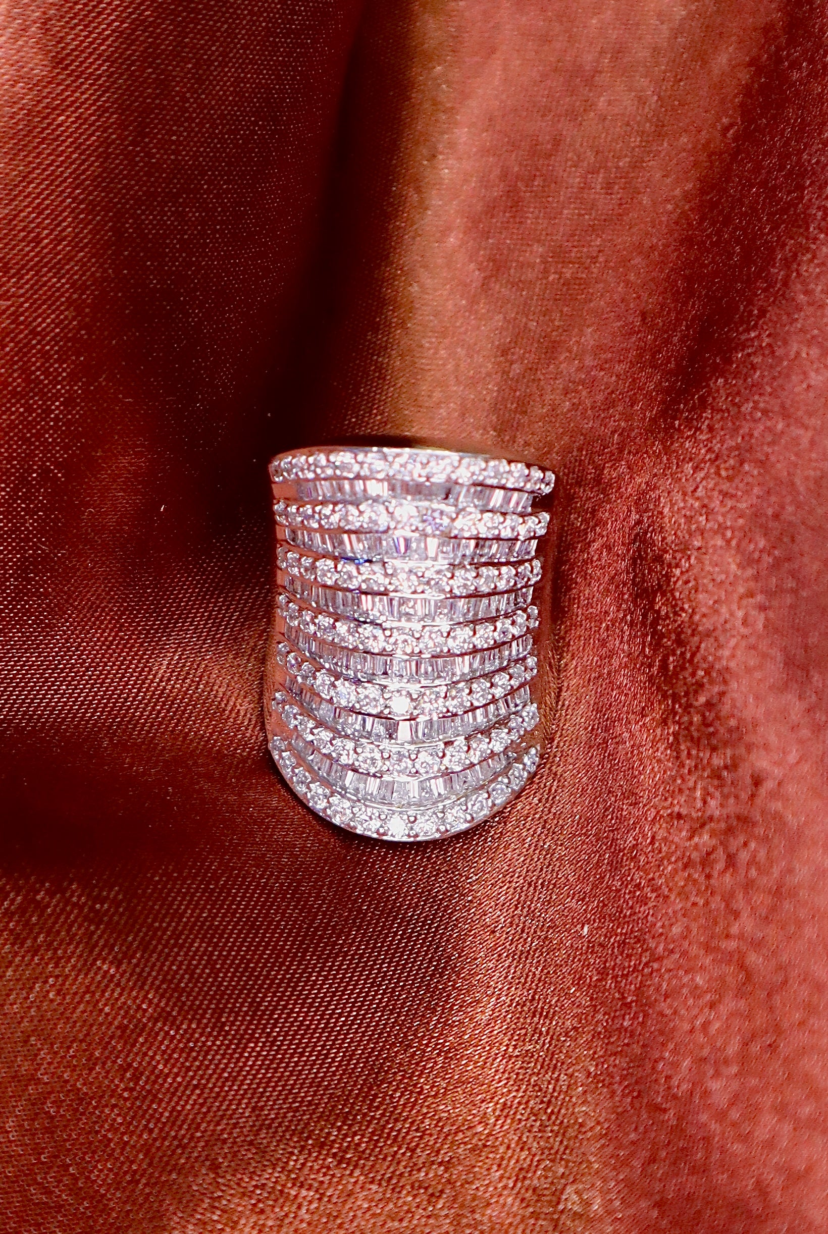 This amazing ladies diamond cocktail ring is one of the most beautiful rings we have ever offered. It is not only an incredibly unique ring, but the diamonds are of the finest quality available. The ring is set with almost 3 carats of round and baguette diamonds. These diamonds are all matched in color and quality, and together sparkle like stars in the sky! The ring was designed and made in 14 karat, solid white gold. We consider this ring wearable art! It’s comfortable on the hand and is always appropriate to wear. A truly magnificent piece of jewelry!